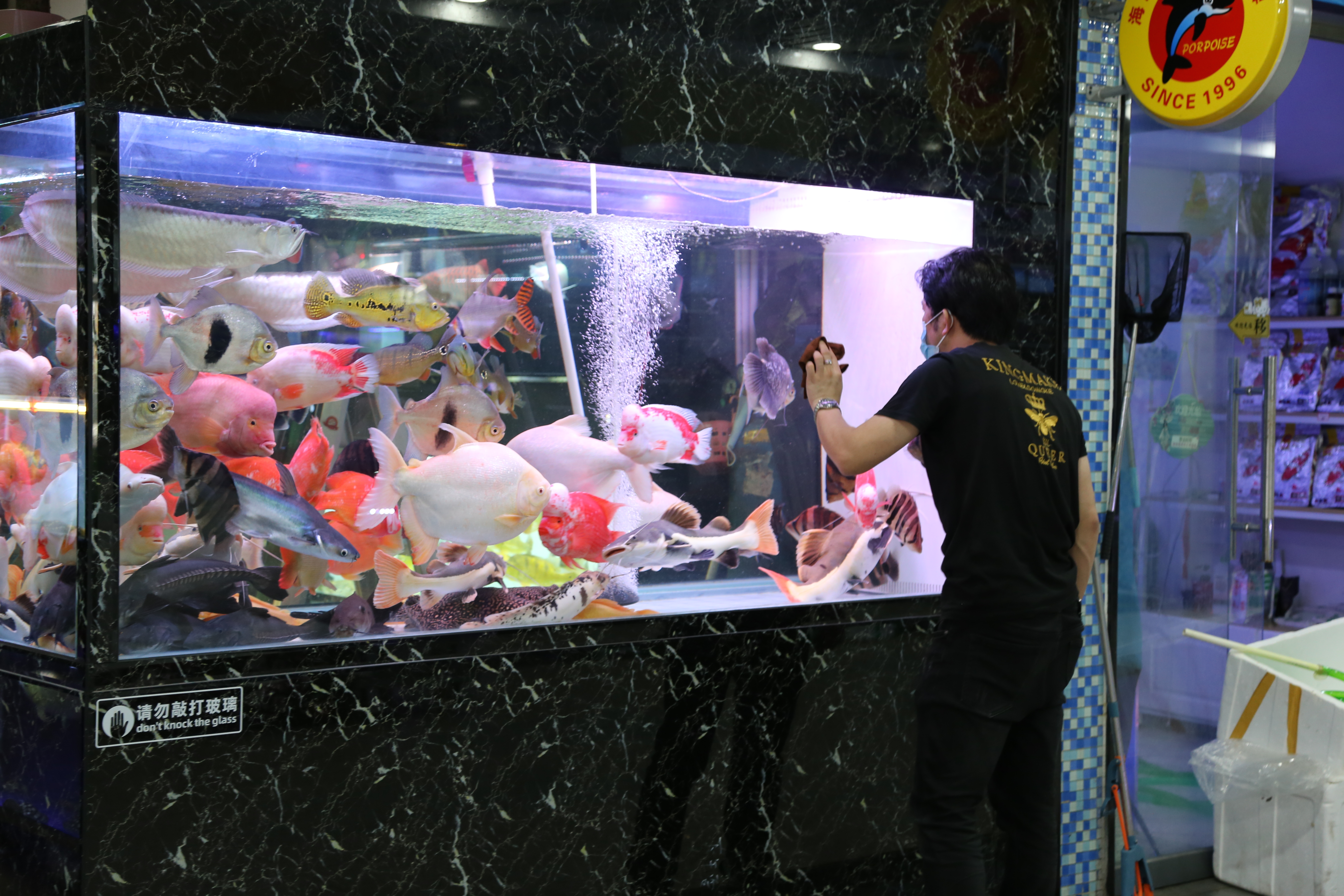 ▲6月9日,封控期间的芳村花鸟鱼虫新世界里,一个个鱼缸灯明透亮,鱼儿自在游动。海龙街道引导支持广东省水族行业协会20余名留守会员成立应急行动组,承担起芳村花鸟鱼虫新世界千余个档口、上万口鱼缸、数十万各类观赏性水族活体的照料以及水电巡检工作,全力确保疫情防控期间安全底线不失、经济损失最小。