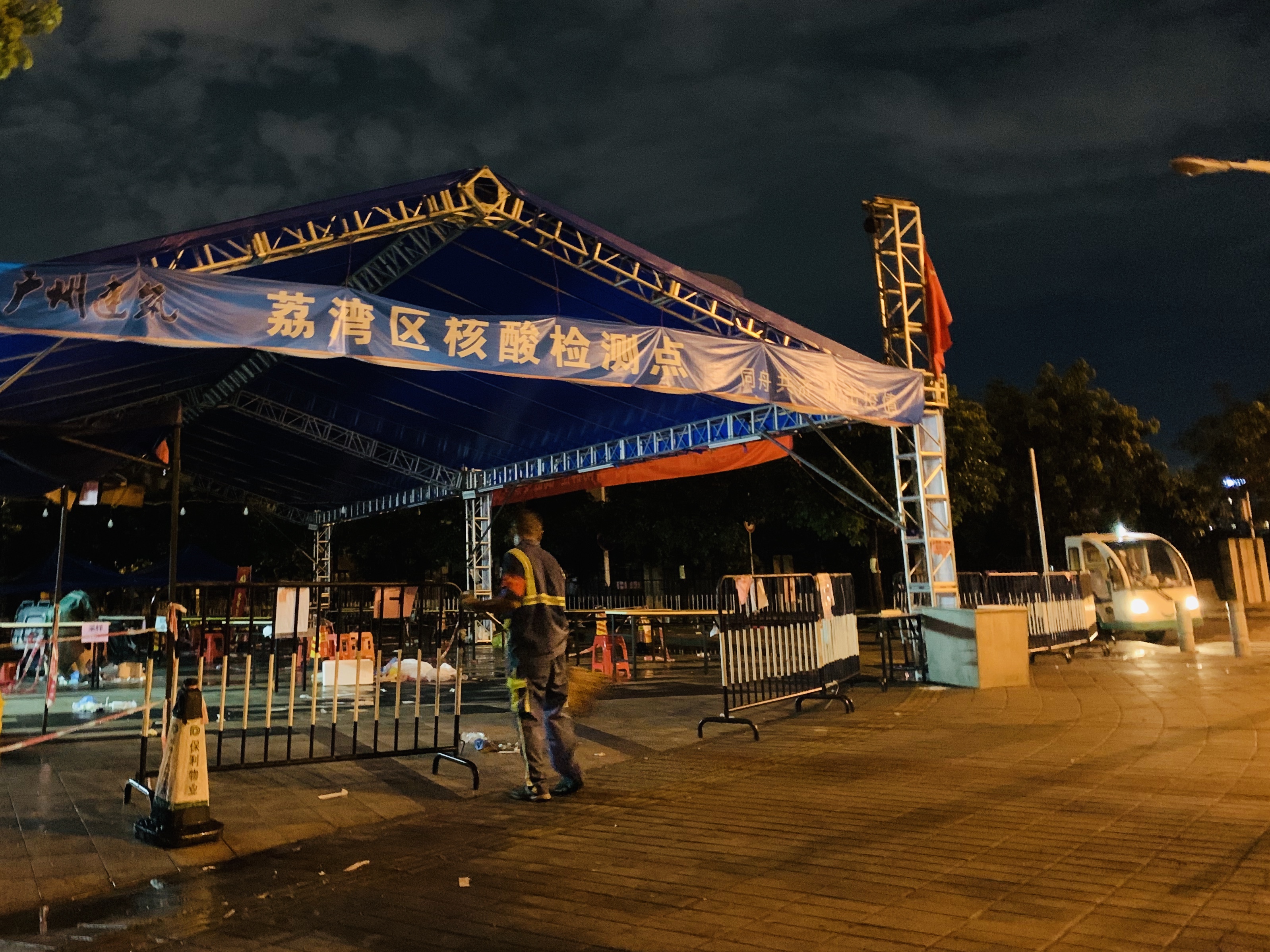 ▲6月11日凌晨,海龙街环卫站的工作人员仍然在核酸检测点清扫着。海龙街面积9.5平方公里,每次大规模核酸检测设置高达14个检测点,环卫站仅10余人的队伍,需要在检测当天每隔1小时对现场进行消毒消杀。检测结束后,他们需要穿戴防护服、专人专车运走医疗垃圾,而后对检测点进行全面的清扫、消毒。凌晨,当大家都在睡梦中时,他们仍奔走在核酸检测点之间。