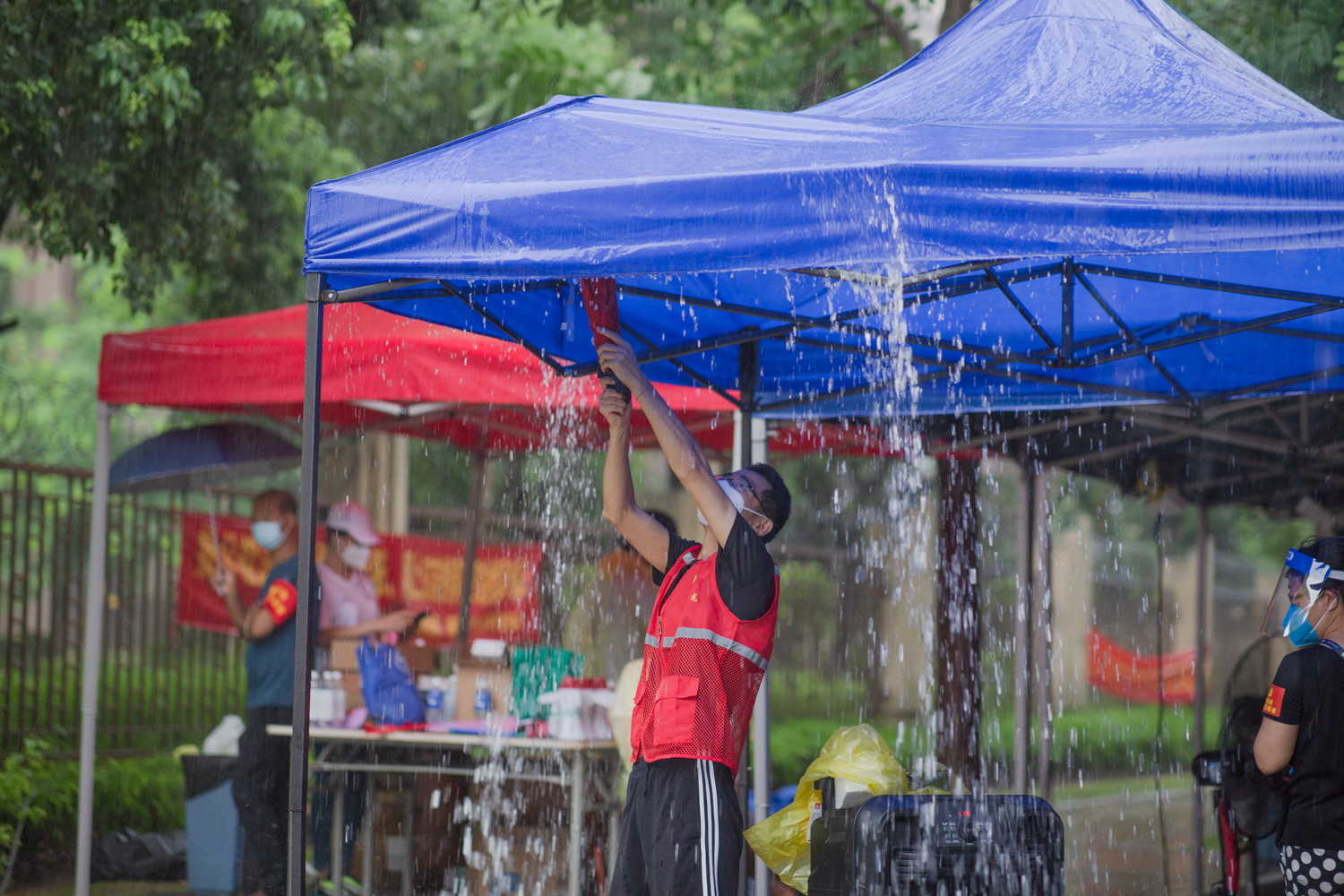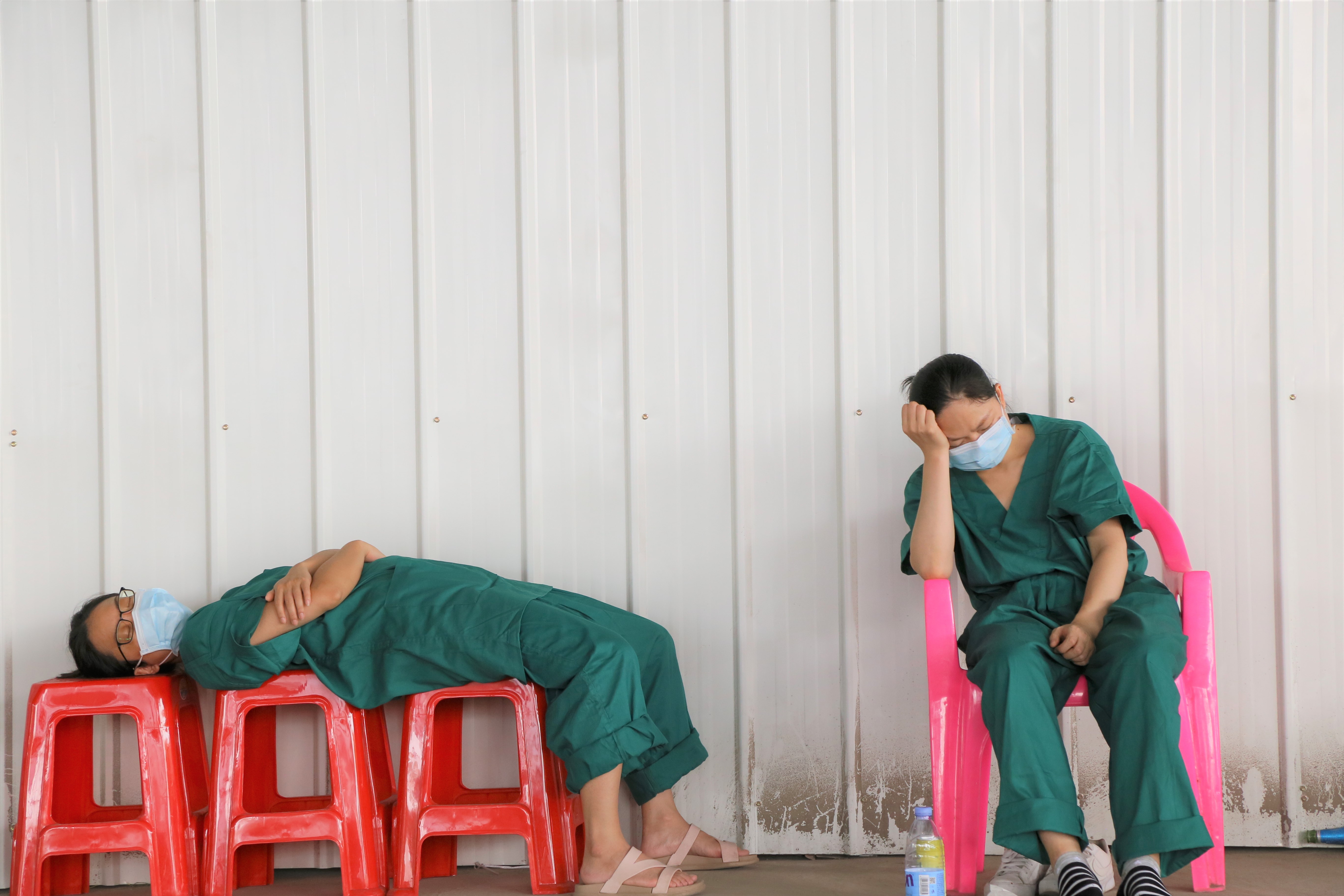 ▲6月5日,海龙街第3轮大规模核酸检测现场,疲惫的医护人员进行短暂的轮换休息。海龙街面积广、人口多,即使设置了13个核酸检测点,大部分点位一天内需要采样1万以上人次。