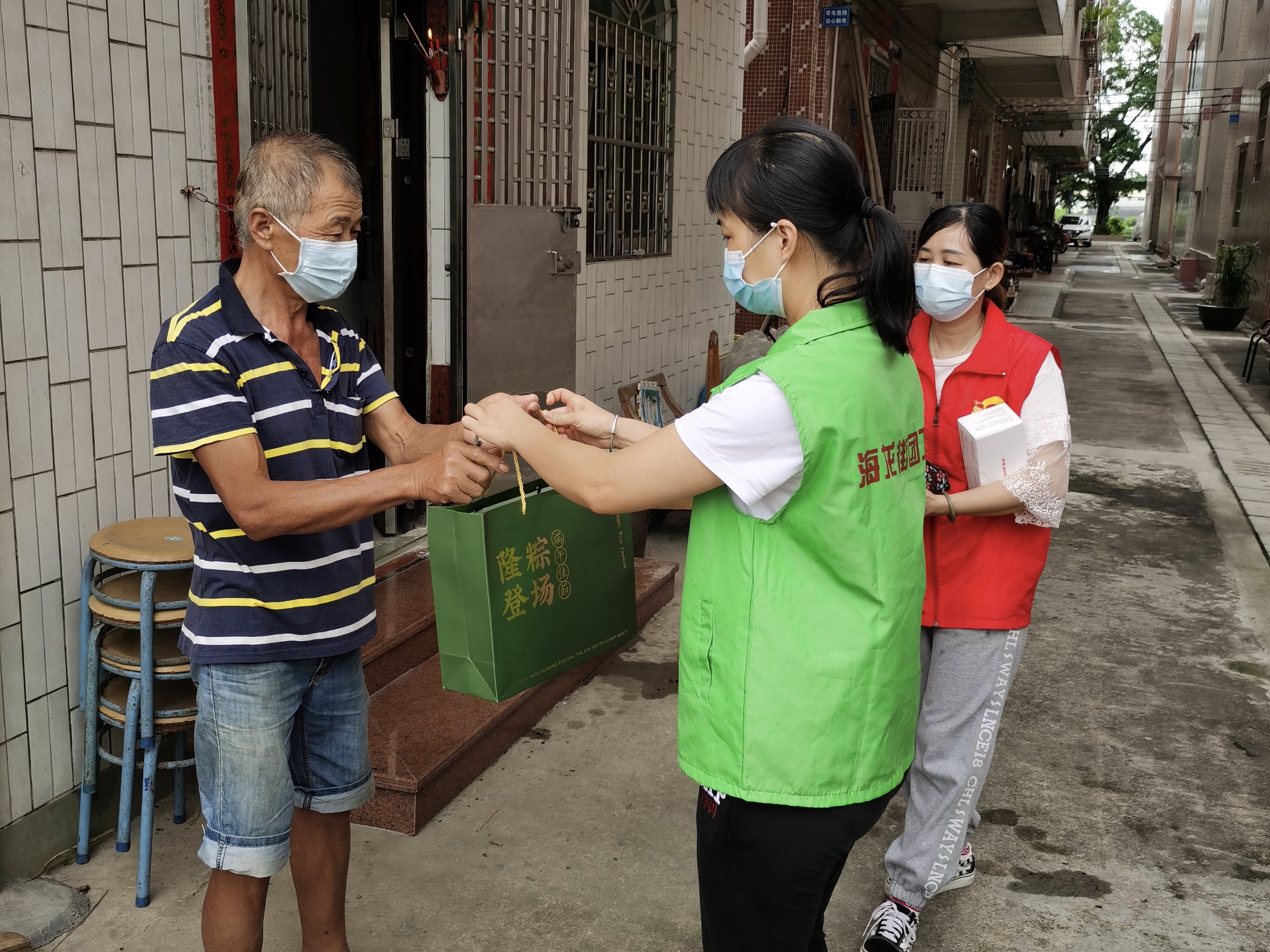 ▲6月14日端午节,海龙街道党团志愿者、街道社区工作人员将公益单位、爱心企业捐赠的粽子、瓜果蔬菜等物资,分派到辖内孤寡老人、贫困家庭、滞留人员的手中。