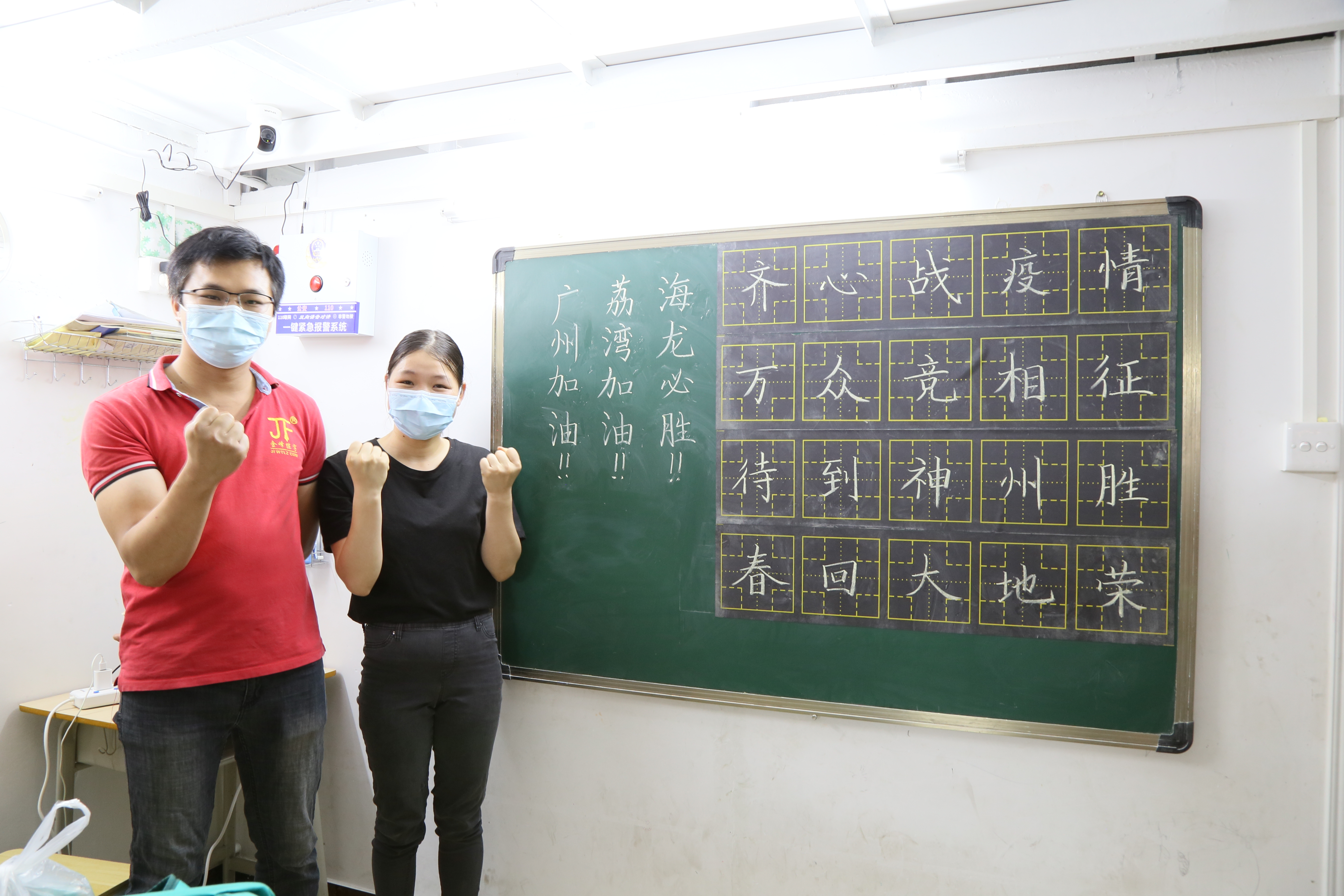 ▲6月13日,位于海龙街江北社区的某练字培训机构,负责人何志峰、成红浪夫妻二人在黑板前留下了合照。重点防控期间,他们将培训场地免费提供给核酸检测一线,用于医护人员休息、工作人员贴码、物资存放等,夫妻二人还主动加人志愿者行列,帮忙贴条形码、打扫卫生等。