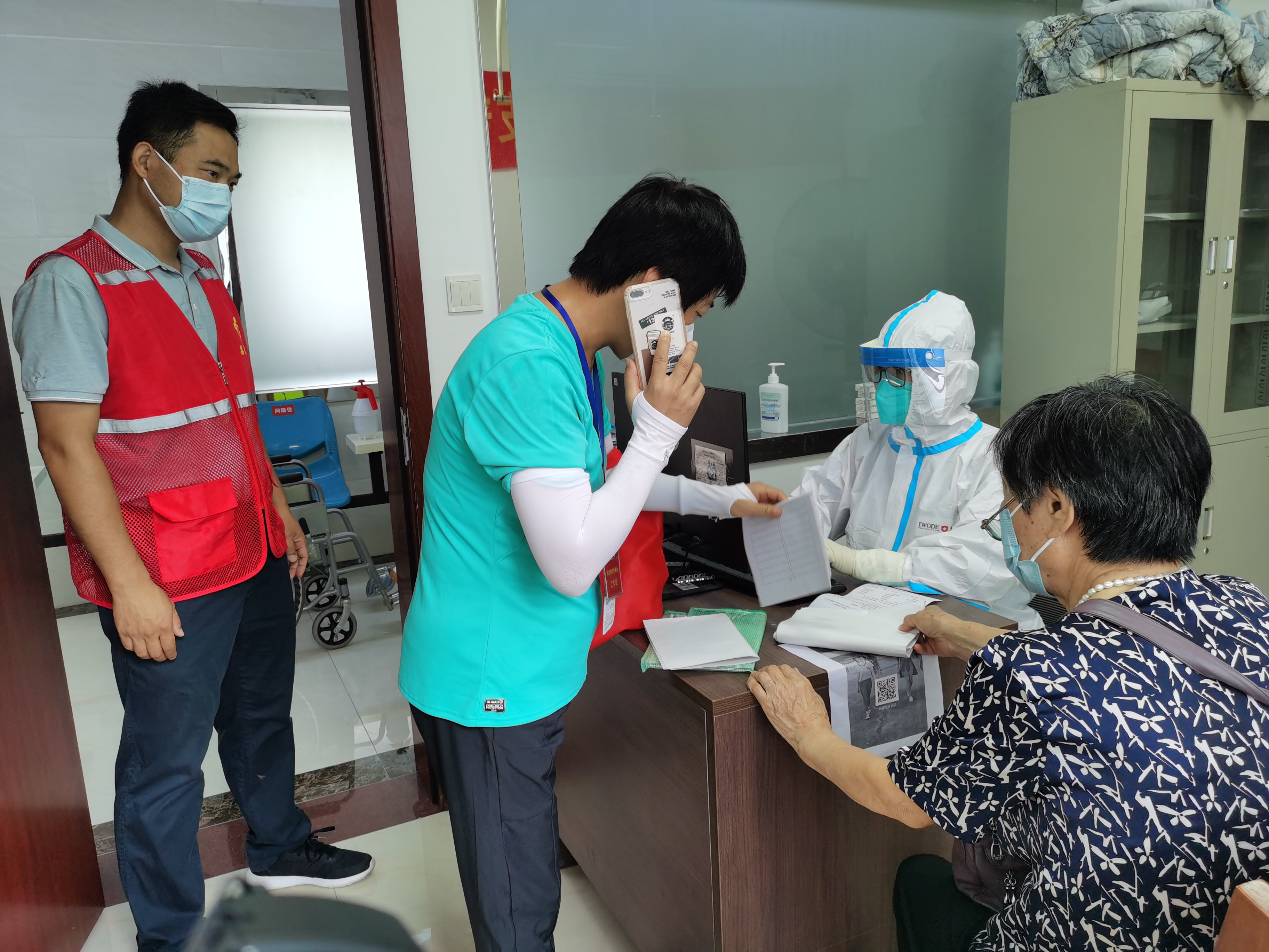 ▲6月10日,在海龙街道大规模核酸检测现场,有一位特殊的医护成员,她是来自湖南的一名退休医生王利琴。儿子罗琳阳是海北社区党总支副书记,同时也是三人小组成员,母亲白衣执甲、支援一线,儿子义无反顾、冲锋在前,母子用不同的行动为打赢这场战役默默努力着。