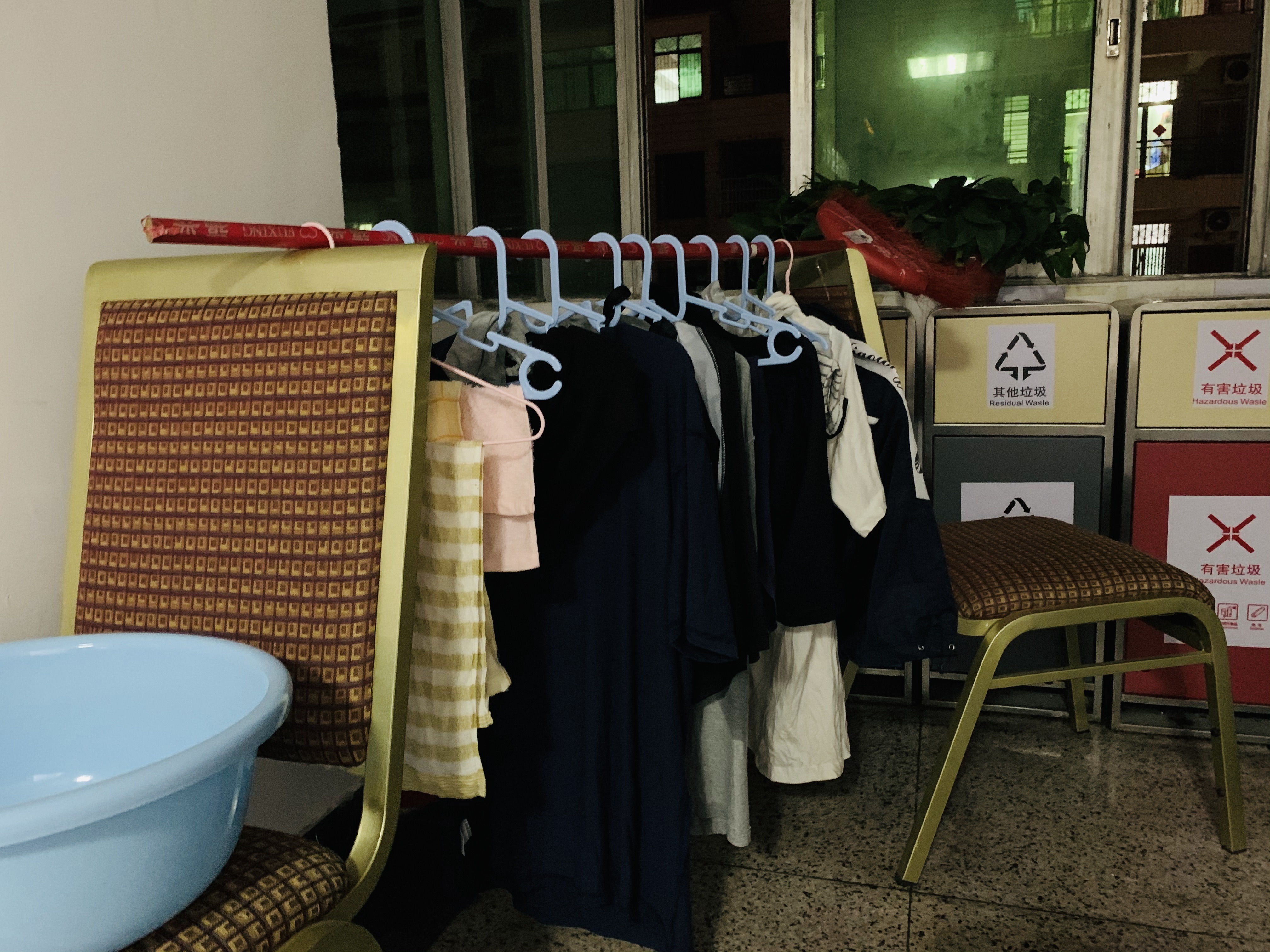 ▲6月15日,在海龙街道办事处的走廊一角,用两个凳子、一个扫把组成的晾衣架,满满当当地挂着一排湿哒哒的衣服。自5月29日以来,街道办、社区联社工作人员全部居住在办公室,睡在折叠行军床或者拼凑的桌面上,24小时待命。