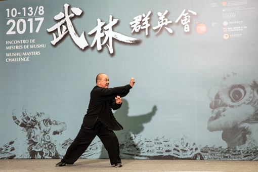在第二届澳门武林群英会记者招待会上,房胜棠展现广州北胜蔡李佛拳,图中动作是虎爪