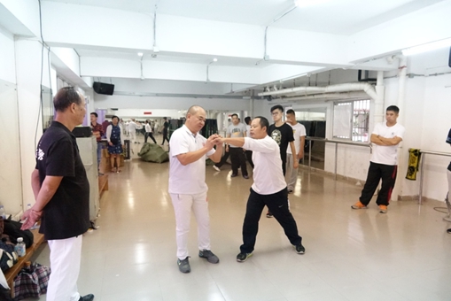 房胜棠指导广东仲恺农业工程学院体育部老师插拳动作,为武术进校园培训骨干力量