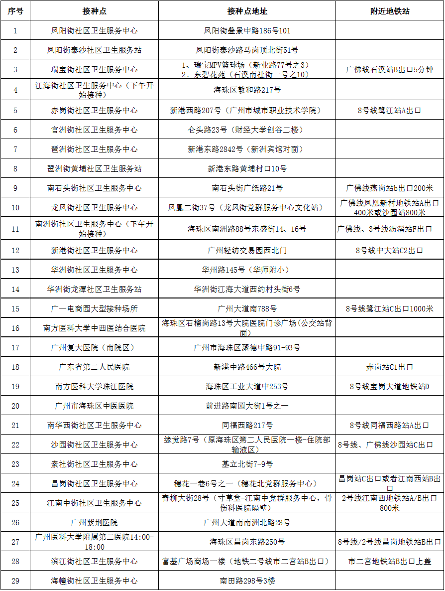 6月28日,广州市海珠区有29个新冠病毒疫苗接种点,提供国药北京生物和北京科兴中维两种疫苗(视各接种点的存苗情况而定)。欢迎接种第一针疫苗已超过21天的街坊现场取号接种,随到随打。