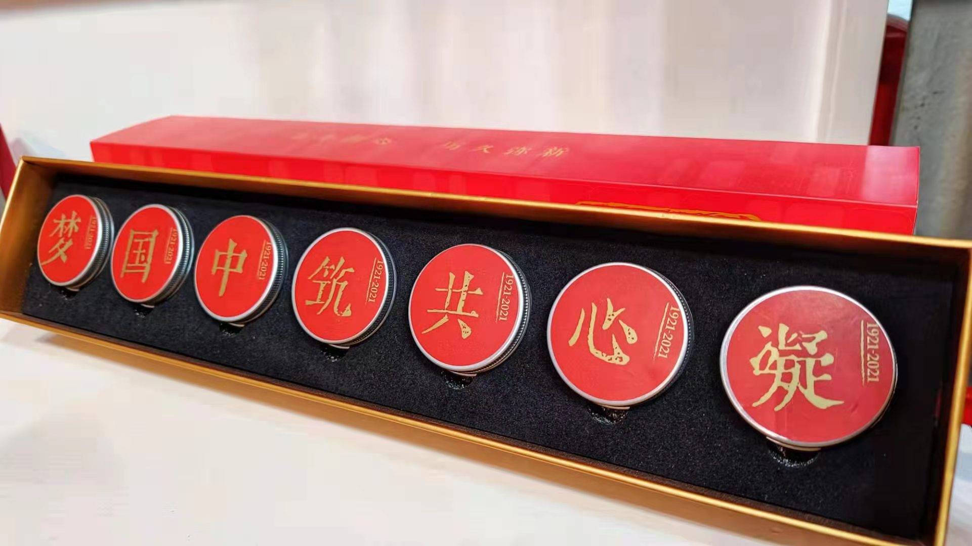 广州农讲所、海丰红宫红场……在6月28日于广东省博物馆开幕的“红色热土 不朽丰碑——中国共产党领导广东新民主主义革命历史展”展厅侧边,一个明亮宽敞的小空间里,摆在醒目位置的一套纪念徽章引起了记者的兴趣。这套徽章,构图简练,以红色为最主要的基础色,分别配以蓝天、绿树、流水等鲜明的色块,大气、严肃,令人爱不释手。在它的旁边,还有很多设计精美的文创品,主题都是“红色”。