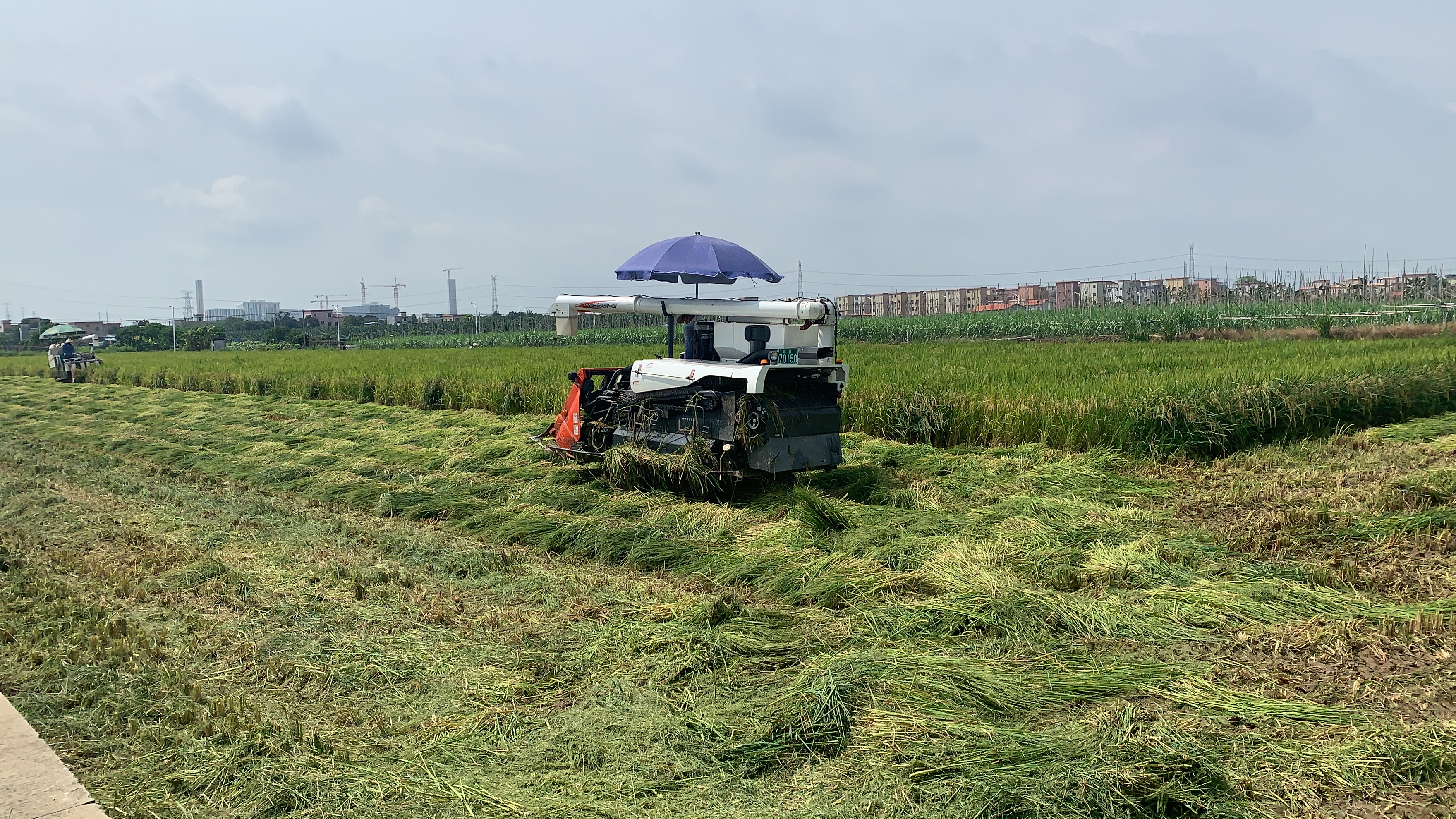 6月26日上午一大早,大岗镇南顺二村种植户郭大哥就到所种植的24亩象牙占2号水稻田开始收割。伴随着阵阵马达的轰鸣声,收割机在农田里来回穿梭,一排排水稻迅速倒下,切割、脱粒一气呵成。据郭大哥的现场讲述,收割采用机械化方式,既快捷又方便,一小时就可以收割5到6亩的稻田,在种植过程中也使用无人机帮助喷药,省下了不少人力,他对今年早稻的收成非常满意,测产均达到亩产千斤以上(湿谷)。
