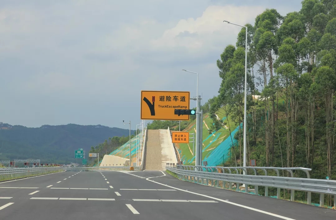 韶新高速属于山区高速,其中松山隧道北行全长7948米,南行全长7970米,是广东省最长的高速公路隧道,隧道内有连续的上坡和下坡路段,其中隧道中间位置K57为整段韶新高速的海拔最高点。由松山隧道内往南至新丰西互通(梅南服务区)有连续11公里(K57-K68)的下坡转弯路段,往北至周陂互通有连续14公里(K57-K43)的下坡路段,且新丰西互通(梅南服务区)和周陂互通分别位于南行和北行的坡底位置,此两处路段坡长弯多安全隐患较为突出,途径该路段司机需更加谨慎驾驶。
