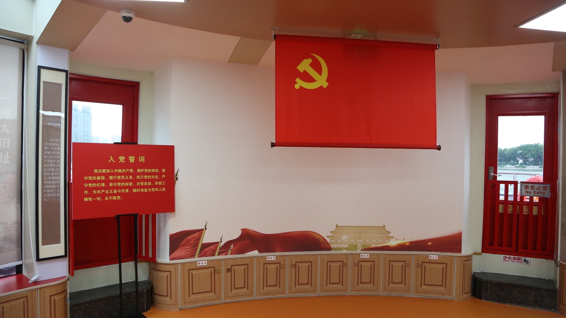 记者在天字码头看到,“广州红”主题船外观以红色为主色调,船内融合中共三大会址与中共中央机关旧址“春园”等元素。其中,一楼船舱参照中共三大会址部分场景模拟打造,客舱分为前区与后区两个部分。前区为中共三大会议模拟区域,该区用特色“砖墙”造型以及复古桌椅等进行情景模拟;客舱后区通过复古餐桌等模拟 “春园”场景。另外,船舱四周展览框介绍有10个广州革命旧址,展览内容由中共三大会址纪念馆策划撰写。活动参与者置身船舱便可获得沉浸式红色文化体验。