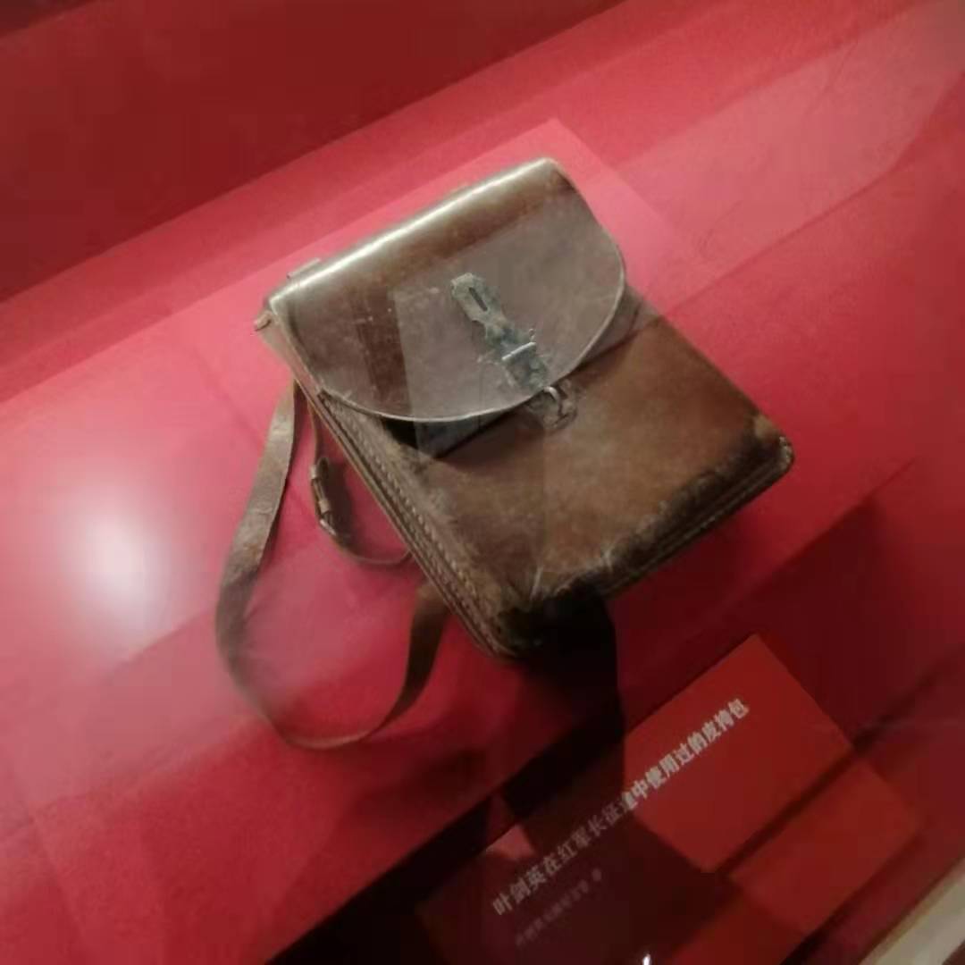 这个挎包是叶剑英在长征途中用于携带重要文件所用。经过80多年的风雨,皮挎包的边角和肩带已有些斑驳,但它的皮质却是非常的坚硬,即使经过那么长的时间,也没有任何的脱落,依然守着它的责任和使命。