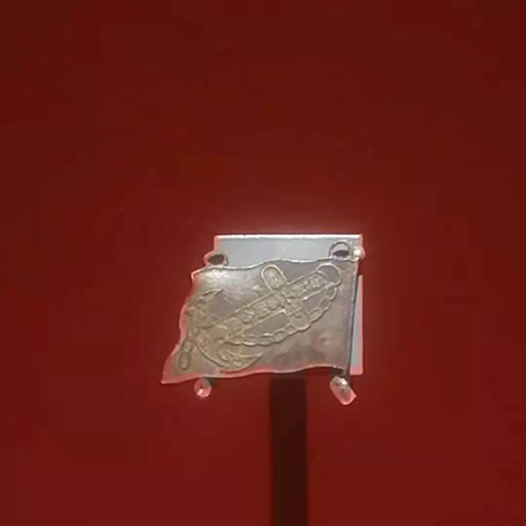 徽章形状是一面飘扬的旗帜,上有铁锚图案和中文“中华海员工业联合总会”及其英文缩写。1921年3月6日,香港中国海员成立中华海员工业联合总会,领导人为苏兆征、林伟民(后来都加入中国共产党)。这是中国最早的产业工会组织之一。