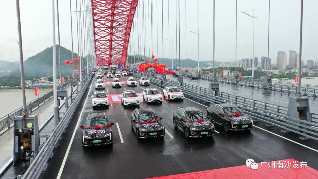 当天在活动现场,102辆车组成的汽车方阵由自动驾驶的小马重卡和小马智行,广丰新一代汉兰达、威兰达、凯美瑞,以及造车新势力合创007新能源汽车等“南沙车”领头开路,率先驶过新开通的明珠湾大桥。