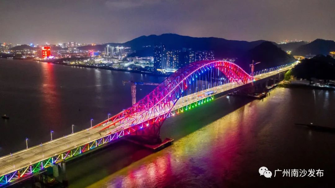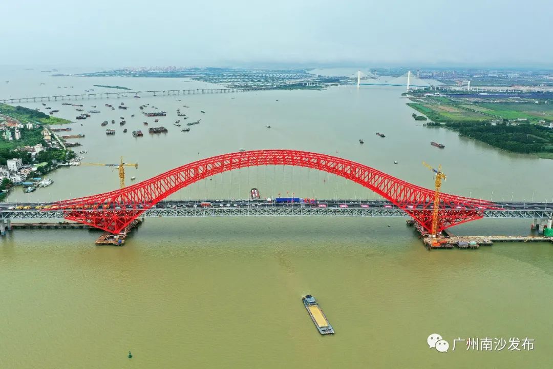 该桥结构设计新颖,大量应用新结构、新材料、新设备、新工艺。不远处便是桥体呈现蓝色的南沙港铁路龙穴南特大桥,海天之间红蓝相应的两座大桥一同见证了近年来南沙区的高质量发展。