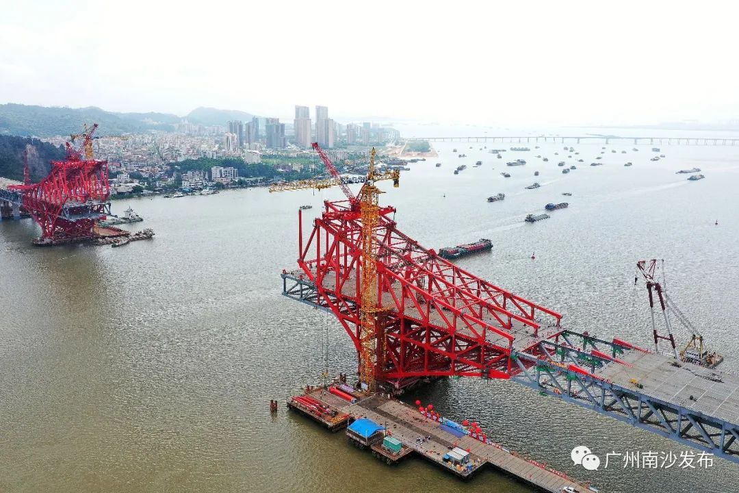 这是全世界跨度最大的“三主桁钢桁拱双层桥梁”。主跨436米的大桥横亘珠江入海口,这对于抗风方面的技术要求极高,施工难度大。