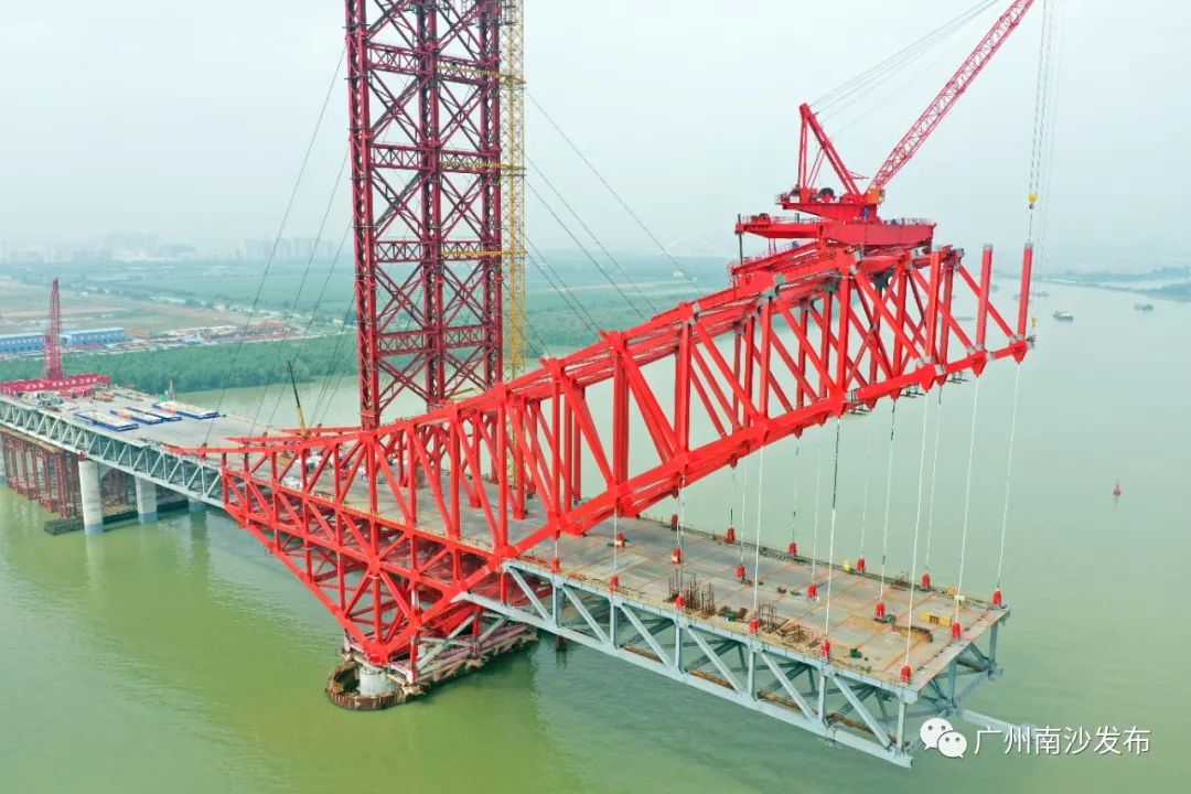 2020年9月,明珠湾大桥吊索塔架封顶,进入主跨钢梁大悬臂架设阶段;