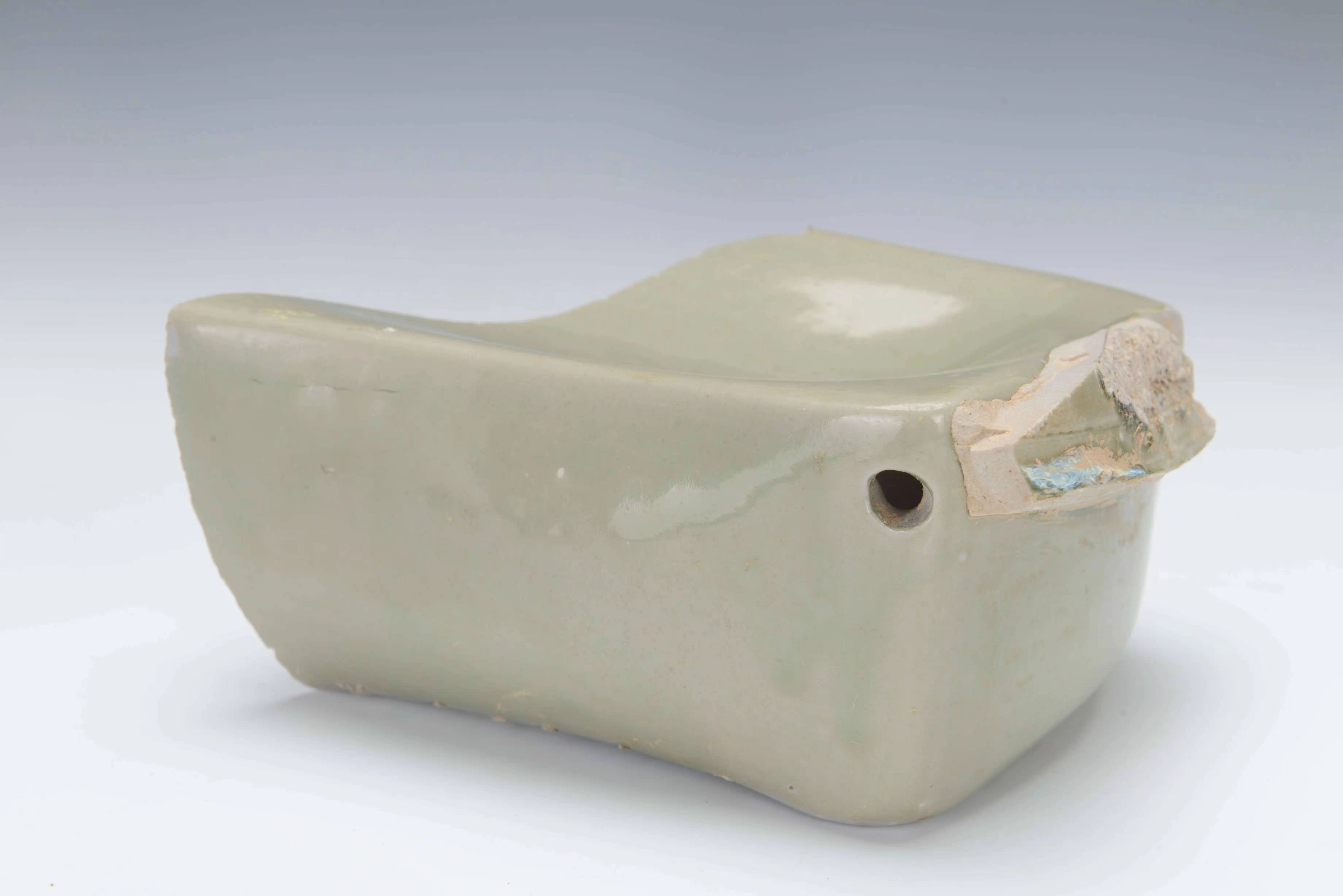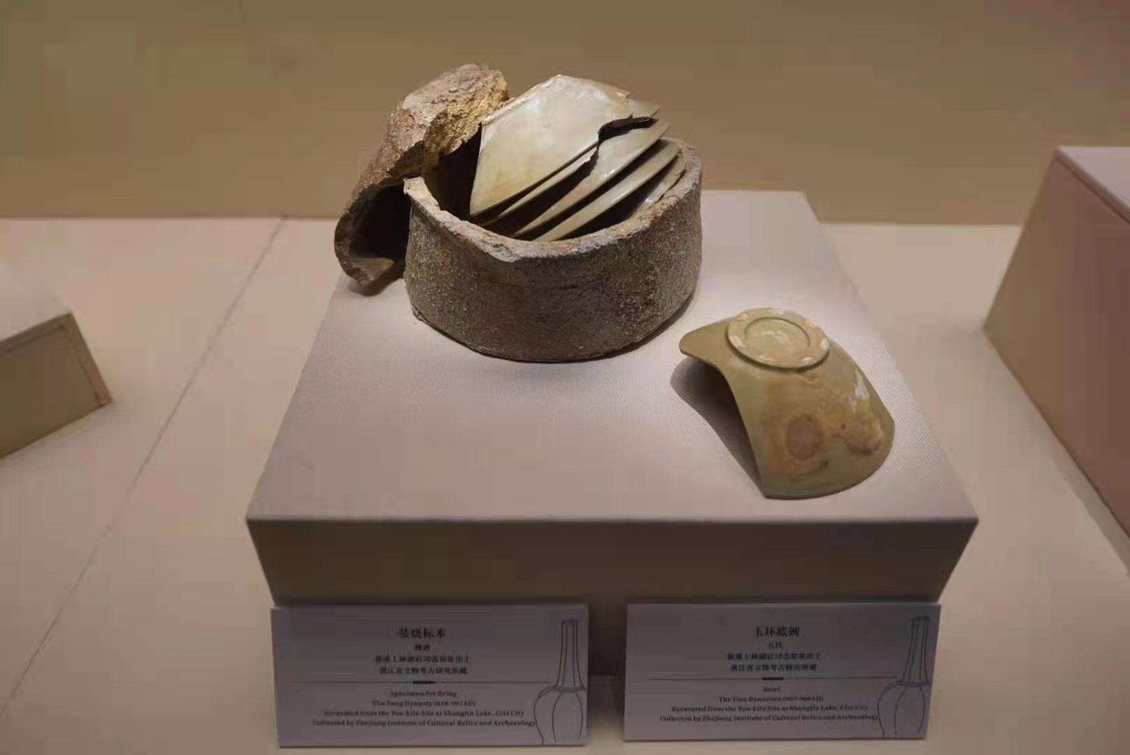 馆方的专家告诉记者,后司岙是晚唐五代时期绝大多数秘色瓷器的产品。它创造性地使用了瓷质匣钵,使得秘色瓷在受热膨胀、冷却收缩的过程中与匣钵保持一致;也能让匣钵内的气体可以在涂封匣钵接口的釉处于熔融状态时排出,冷却时接口处的釉凝结,保证匣钵内的瓷器始终处于还原气氛中,从而烧造出“青绿秘色”。