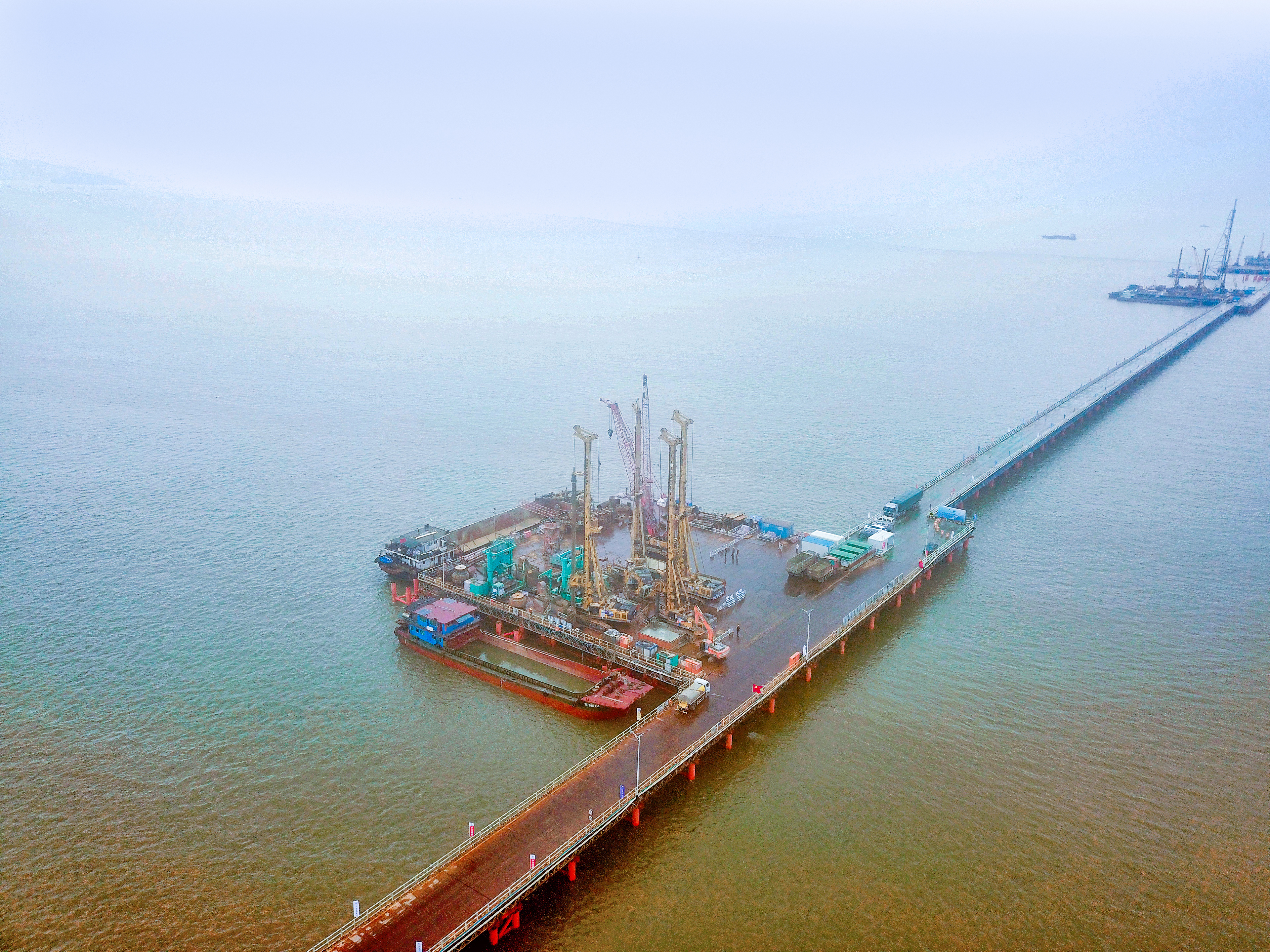 黄茅海大桥为世界最大公路三塔斜拉桥,主跨跨径达2x720米,桥梁全长2200米,共有主墩基础102根。高栏港大桥采用双塔斜拉桥设计,跨径700米,桥梁全长1416米,共有主墩桩基62根,最大孔深约120米,属于海上大直径超长基桩施工。