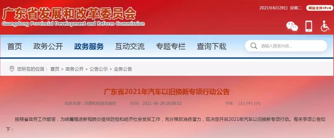 6月29日,广东省发改委发布《广东省2021年汽车以旧换新专项行动公告》。公告指出,从2021年7月1日起至2021年12月31日止,持有广东省号牌个人消费者在省内“以旧换新”,最高可申请10000元/辆补贴。
