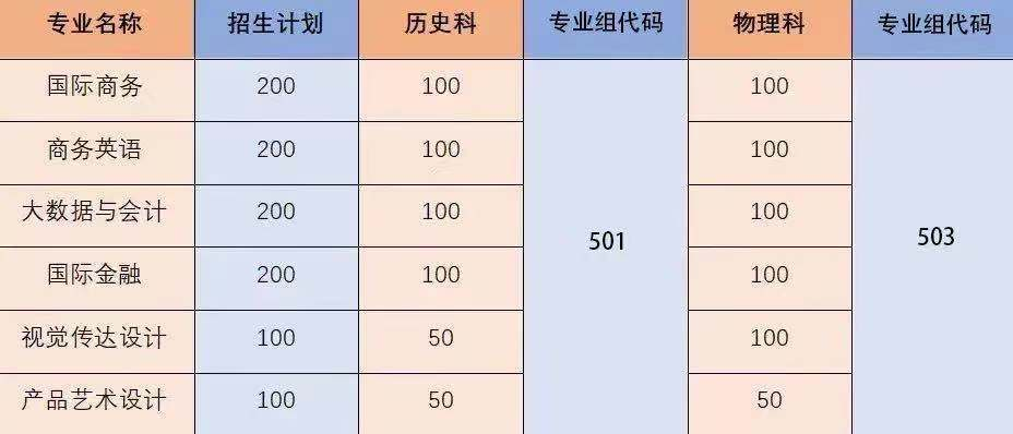 该校本科42个专业(方向)划分为10个院校专业组(按照门类以及学费分层次划分),历史类分为4个院校专业组(普通类专业201专业组18个专业、中外合作办学202专业组1个专业、国际联合培养203专业组4个专业、中英双语创新班204专业组4个专业),物理类分为5个院校专业组(普通类专业205专业组24个专业、中外合作办学206专业组1个专业、国际联合培养1个组207专业组专业、中英双语创新班208专业组4个专业、华为创新班209专业组4个专业),美术类1个院校专业组5个专业。