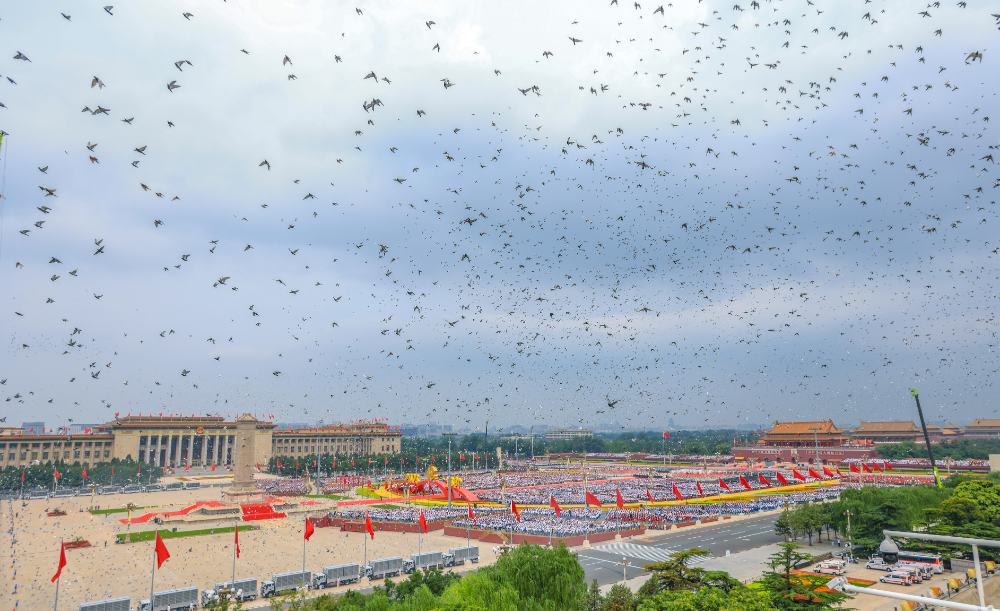 10万羽和平鸽振翅高飞,在人民英雄纪念碑上空集结,盘旋。这壮观的景象,三分靠鸽子的天性、七分则是人的努力。