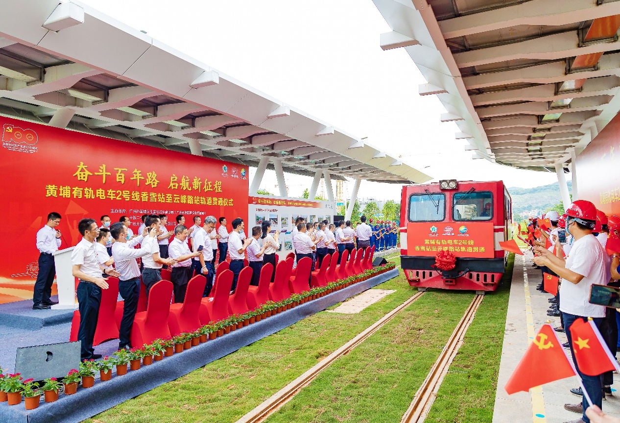 7月1日下午,黄埔有轨电车2号线香雪站—云峰路站轨道贯通仪式在玉岩路站举行。线路全长14.4公里,设19座车站,香雪大道段于2020年10月1日完成轨道及以下工程并于香雪梅花节组织市民试乘体验,全线预计明年底开通试运营。
