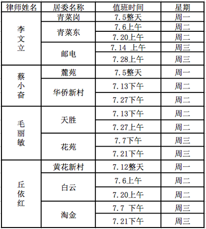 下面是华乐街各社区律师在2021年7月的值班时间表,有需要的街坊们可收藏。