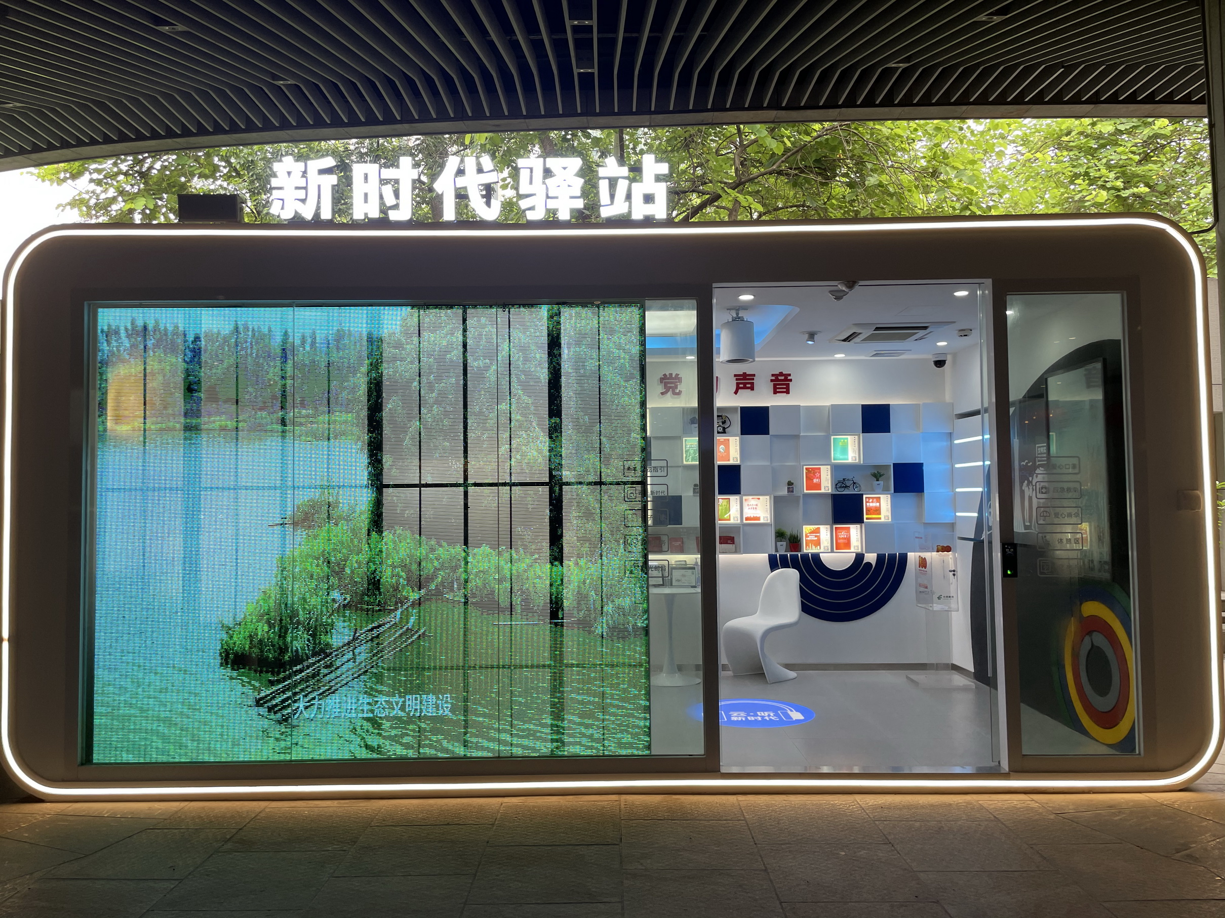 “小驿站有大能量”,走进位于广州塔售票大厅南侧的“新时代驿站·新风尚”,充电池造型让人眼前一亮,寓意新时代赋予新动能,也体现新时代驿站是引领文明新风尚的能量站。这里是海珠区率先在全市探索打造的“小成本”装配式驿站,也是全市首个多功能志愿者小屋“样板间”,并通过科技手段精心打造。外立面打造“信仰”小剧场,定期展播红色电影和虚拟主播讲党课。