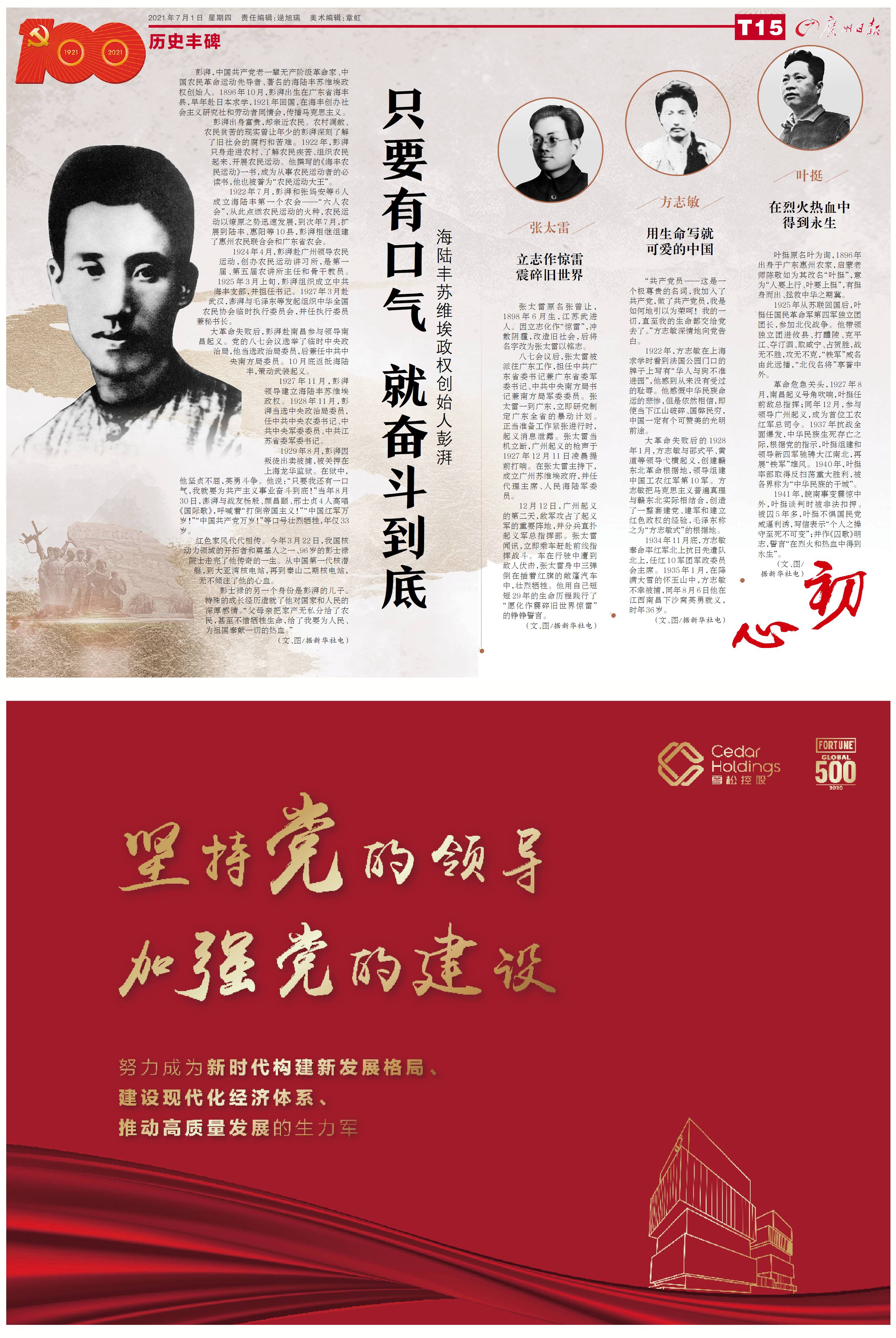 1927年11月,彭湃领导建立海陆丰苏维埃政权。1928年11月,彭湃当选中央政治局委员,任中共中央农委书记、中共中央军委委员、中共江苏省委军委书记。
