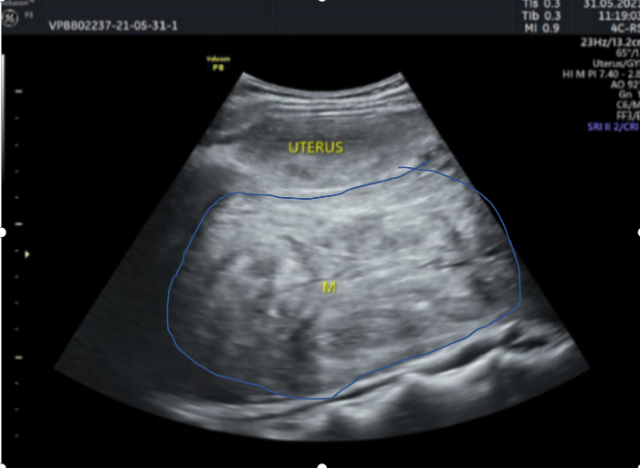 术前彩超检查,子宫后方显示有巨大肿物