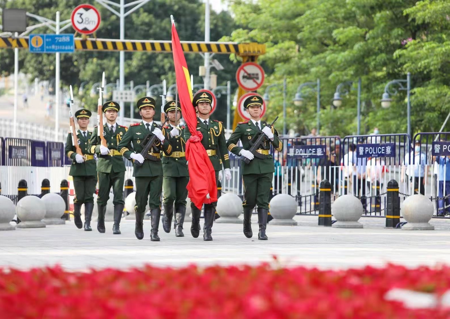 上午8时,升旗仪式正式开始,国旗护卫队迈着铿锵有力的步伐,护卫着国旗走向升旗台。全场肃然而立,过往的群众和车辆纷纷驻足,自觉向国旗行注目礼,齐声高唱国歌,祝福中国共产党百年华诞。