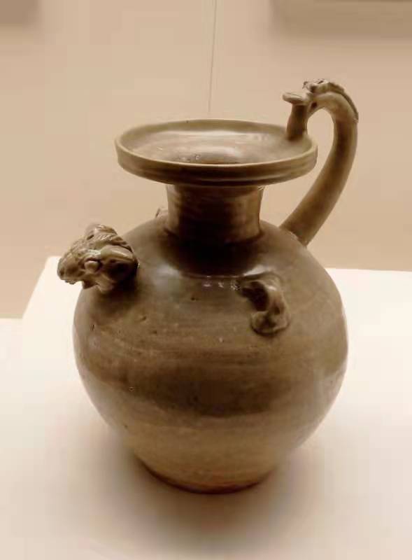 另一件是晋代的羊首龙柄壶。