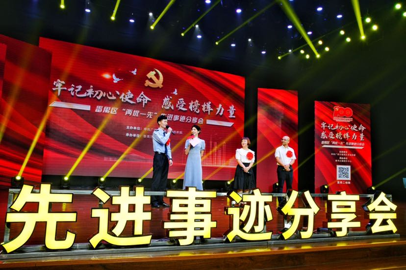 在抗击新冠疫情中,付喜花主动请缨,一直坚守在抗疫临床一线,全面负责发热门诊及隔离病房的工作,用实际行动让党旗在疫情防控斗争第一线高高飘扬;杜汝锋充分发挥“领头雁”作用,团结带领班子成员,不断健全和深化“令行禁止、有呼必应”党建引领基层共建共治共享社会治理格局,村党组织战斗力明显增强;陈智军情系老区苏区,全心全意投入到扶贫工作,为曾贫穷落后的湖中村带来了幸福生活;李波带领水警派出所党支部全体党员冲锋在打击反走私违法行为的最前线,用实实在在的行动努力提升人民群众的获得感、幸福感、安全感;在疫情防控期间,牟晨通过深入社群,了解社情民意,专门成立了一支“防控疫情党员志愿者队伍”,主动联系居家隔离群众,化身“清洁员”“送餐员”“代购员”“快递代收员”,将服务落实到“最后一米”;郑臣喜创新实践“党建+产学研”,组织编写了《创显科教党支部建设标准化手册》,将党建工作与企业发展有机结合,成功打造出具有创显科教特色的党建文化新阵地。区政务服务数据管理局党支部坚持“不忘初心、牢记使命,全心全意为人民服务”的理念,着力促进党建与业务融合发展,引领业务在改革、创新、实效上取得新突破;奥园集团党委始终以党建引领推动企业不忘初心,积极回报社会,担当社会重任,以大爱回馈社会……在事迹分享会上,优秀党员、党务工作者和先进基层党组织代表走上舞台,与大家分享了鲜为人知的故事,党员们的奋进事迹感人肺腑、催人奋进。