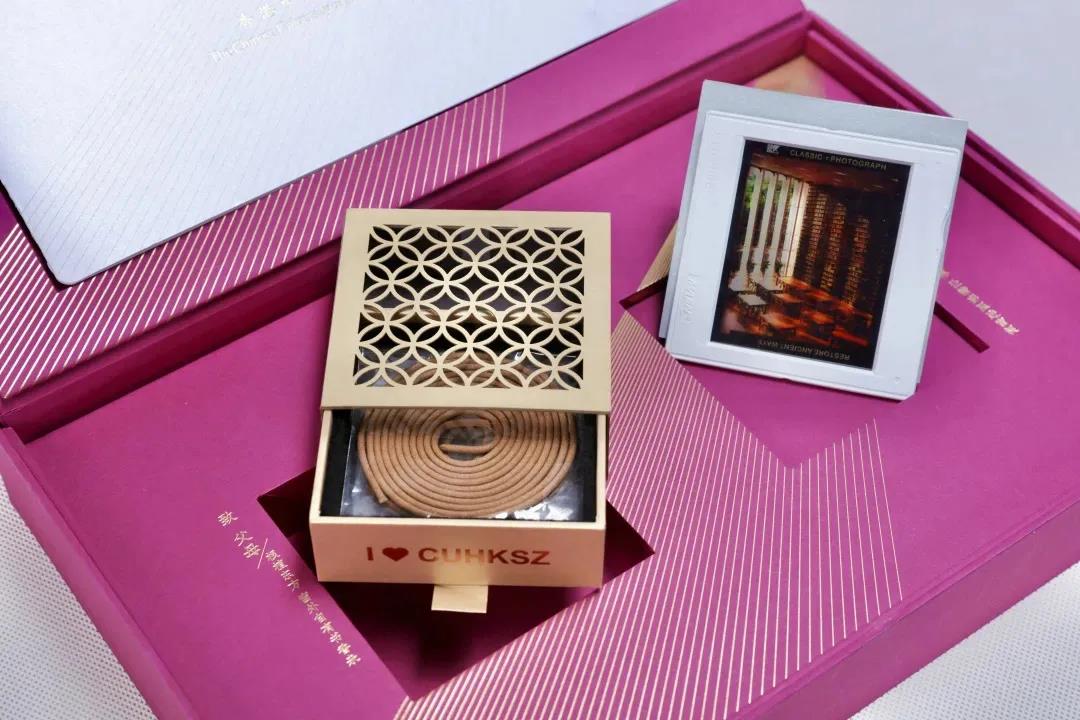 录取通知书礼盒结合传统与现代,融会中国与西方,打开礼盒,映入眼帘的东方之窗和西方之窗的造型,代表着大学对人才的培养理念,学贯中西、汇通古今、融合文理。带有东方之“窗”设计的香盒是送给新生的第一份礼物;具有西方之“窗”设计的胶片,带新生领略校园之美,让人身临其境,仿佛置身其中。