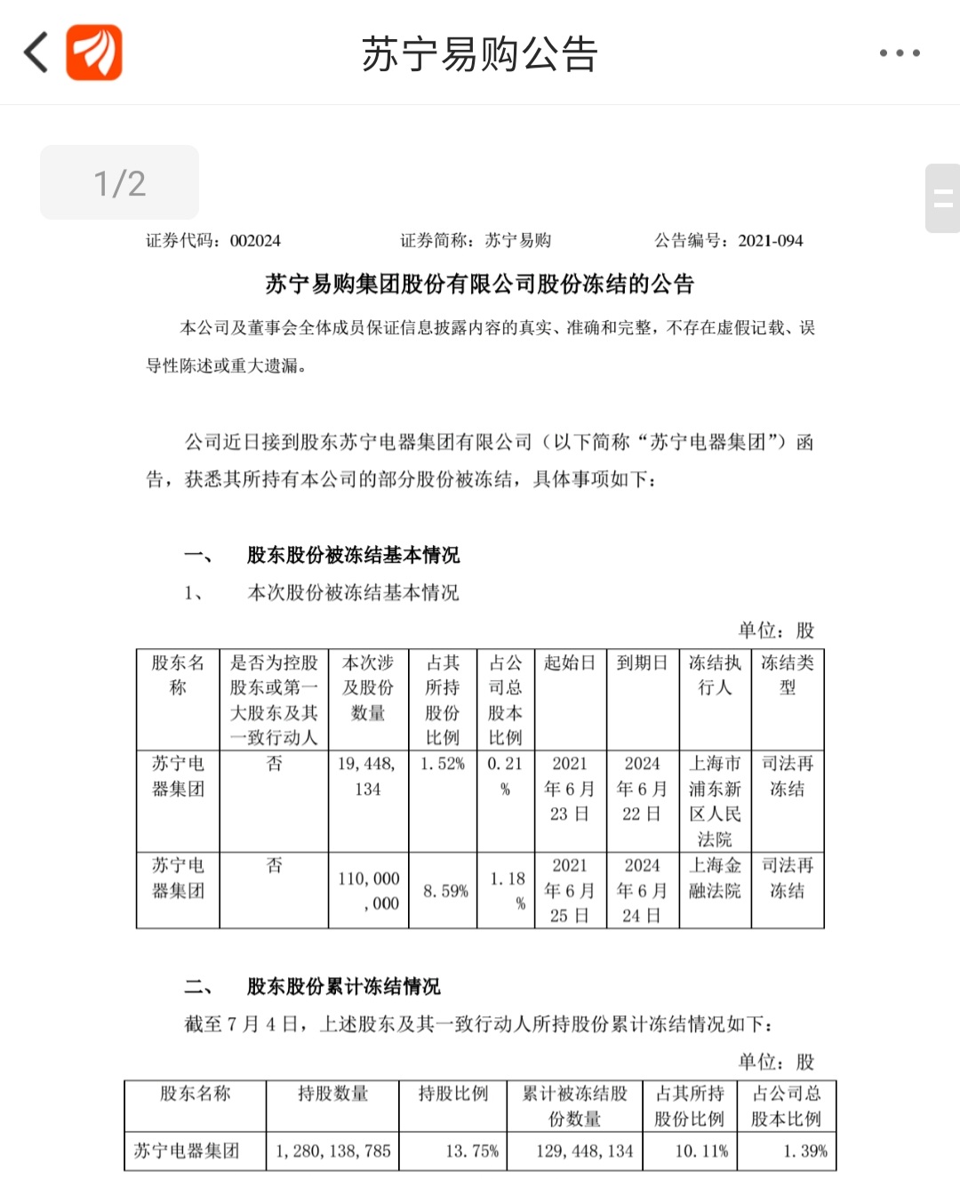 根据公告,本次共计1.29亿股股份被司法再冻结,分别涉及苏宁电器集团持有苏宁易购0.19亿股,冻结执行人为上海市浦东新区人民法院;苏宁电器持有苏宁易购1.1亿股,冻结执行人为上海金融法院。