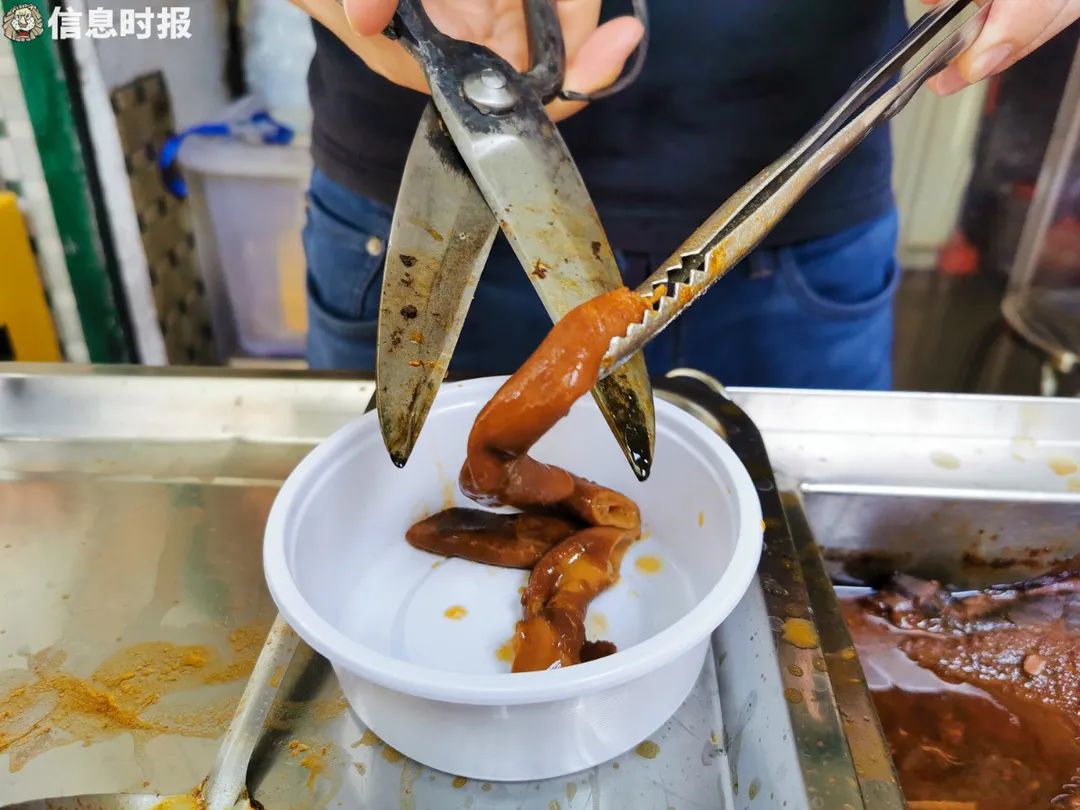 对于老广来说,和味牛杂的吸引之处不仅仅在于其味道浓香扑鼻,就连牛杂档主用大剪刀剪牛杂时发出的“咔嚓咔嚓”的绝妙响声,也惹人垂涎。在起义路贤藏街,有家名为“裕苑”的网红牛杂店。80后老板李腾开玩笑说,当初之所以选择辞去高薪厚职开牛杂档,除了因为发自内心喜欢这份广州街头美食外,大大的牛杂剪刀也是吸引他入行的重要原因之一。“但拿久了才发现其实挺累的,并没有想象中那么好玩。”边忙着为食客剪牛杂,李腾边对记者笑说。