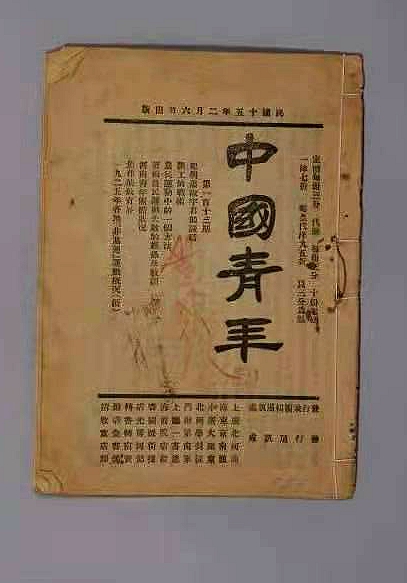 《中国青年》是《先驱》停刊后改出的共青团中央的机关刊物,是“一般青年运动的机关”。它于1923年10月20日在上海正式创刊,1927年10月10日第一次停刊。邓中夏为《中国青年》题写了刊头,恽代英为第一任主编,此后林育南、萧楚女、李求实也相继担任过该刊主编。《中国青年》以指导中国青年参加和进行革命为宗旨,明确表示它的责任是:“有系统的供给青年以革命人生观、革命理论,革命战术,革命经验,从思想言行各方面指出青年的应由之路;同时必须了解现代中国青年在思想上的要求而且力尽所能的去满足青年的要求”。在1923年10月至1927年10月间,该刊共出版168期,刊发国内外约400位作者的各类文章1000余篇。