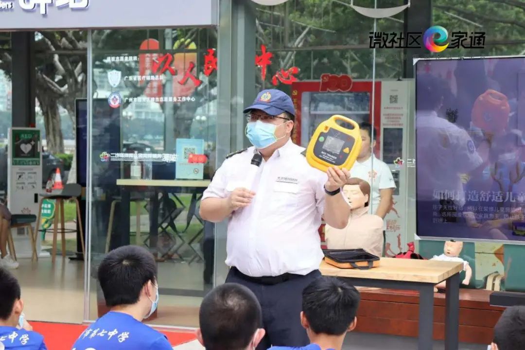 7月3日,驿站举办首场应急知识培训,越秀区暐杰志愿服务工作中心负责人徐暐杰现场为市民群众、体育爱好者讲解应急救护的方法及自动体外除颤器的使用步骤。