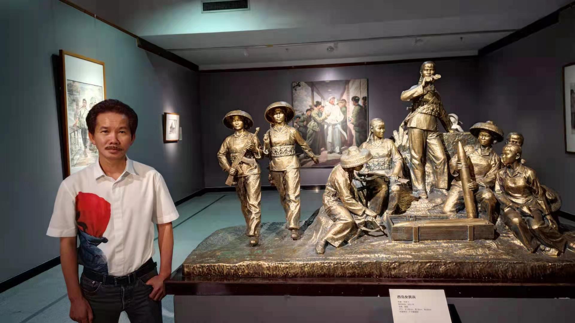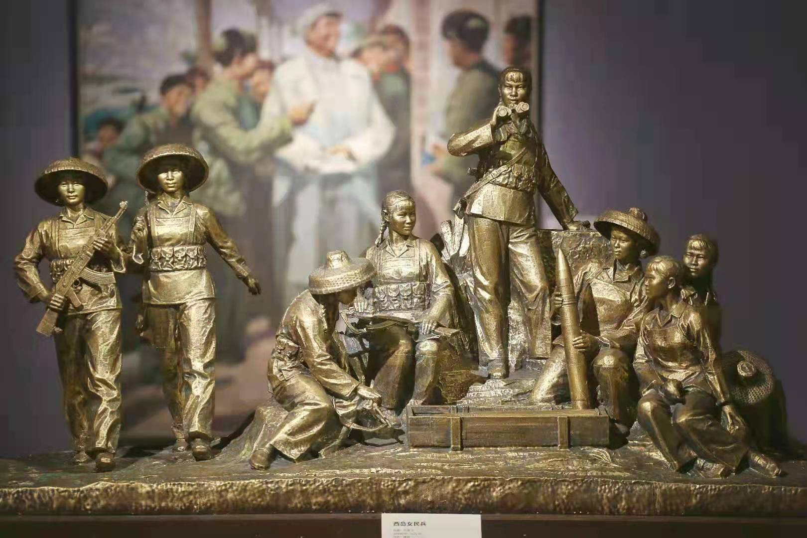 当中,全国政协委员、广州雕塑院院长许鸿飞的《西岛女民兵》是“最年轻”的展品之一。这件铜像由他于今年历时半年创作而成,取材自闻名全国的“西岛女民兵”故事。就是这件新作,不仅在艺博院展出,也陈列在海南三亚市西岛女子民兵连展览馆中,还入选了由中央广播电视总台、中国国家博物馆联合举办,在中国国家博物馆开幕的“无声诗里颂千秋——美术经典中的党史主题展”。
