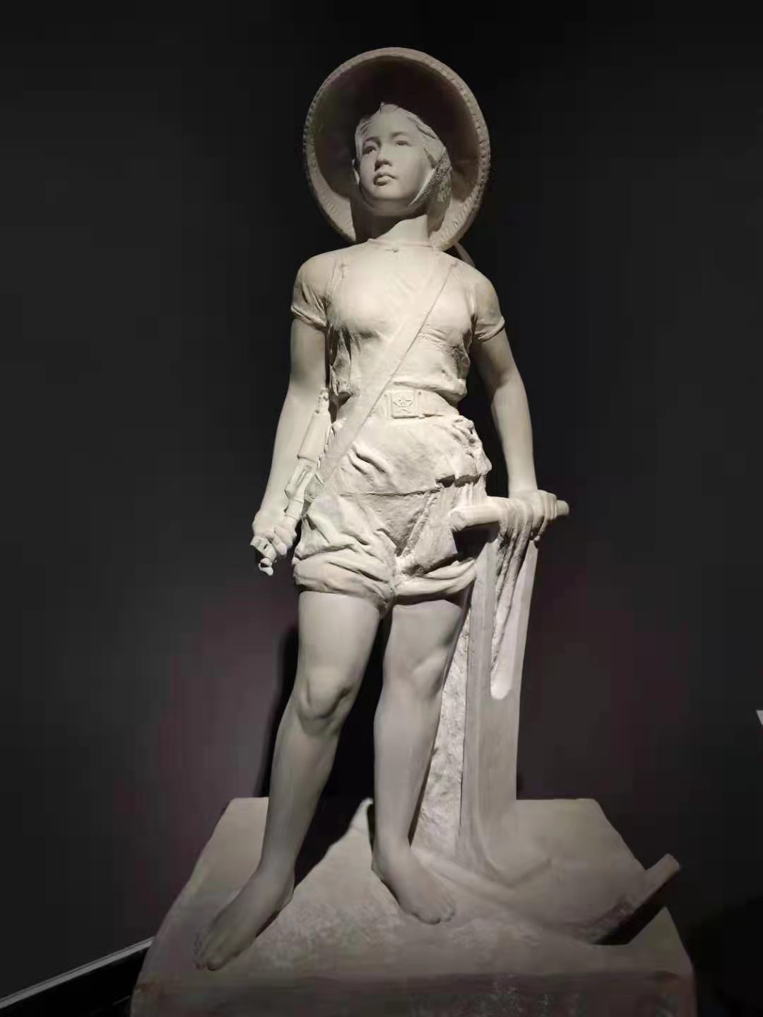 “大家知道,我的作品一般是比较夸张、比较抽象的,但是这件作品,我用很写实、严肃的方式来制作”,在艺博院的展览现场,许鸿飞说,雕塑中女民兵们头上戴的竹编斗笠外形特别,是岛上特有的形制;她们身上背的步枪、扎的辫子都经过了大量的考证;边上的女孩手上握着一枚海螺,而当年训练时,女民兵们正是以海螺声为号集结。