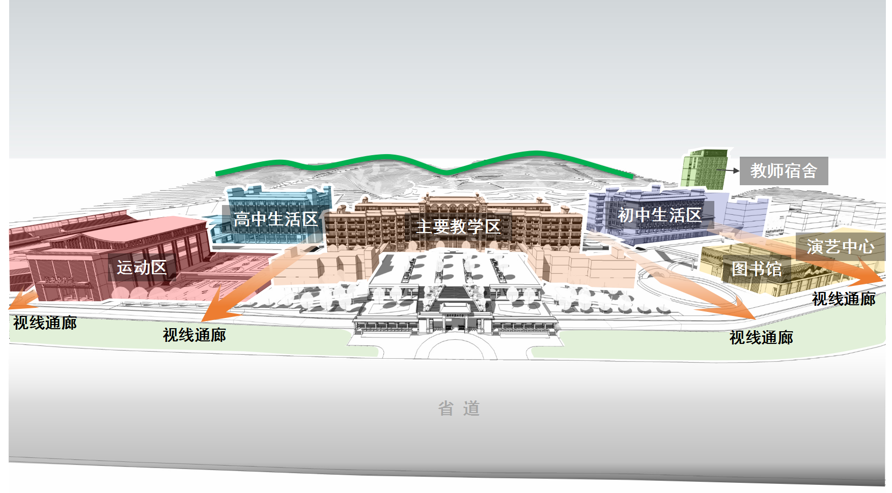 该项目学校用地面积为140770平方米,总建筑面积122988平方米,新增建筑面积113880平方米,容积率为0.76,绿地率35%,机动车停车位230个。结合现状场地地形、学校功能需求,划分主要教学区、运动区、生活区、预留发展区等,形成功能分区明确、交通流线简洁、环境景观舒适、良好校园互动的组合空间。建筑以分级台地、半地下空间来综合利用地形坡度,建筑高度自南向北呈现“前低后高”的层次感,同时结合北部山体轮廓线打造丰富的天际线景观。