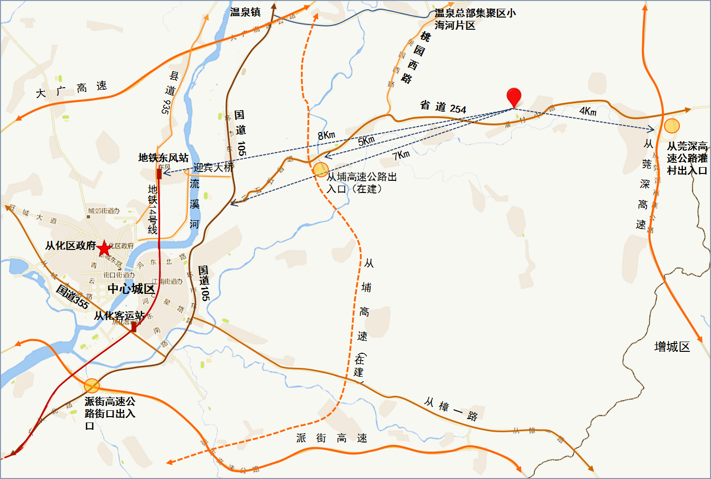 项目地块位于从化区温泉镇总部集聚区小海河片区南侧、温泉镇南星村村域西部,区域产业生态系统高端、周边自然环境优越;地块临近省道254,距从化中心城区约10公里,距地铁14号线东风站8公里,距从莞深高速灌村出入口4公里。由于项目地块控规未覆盖,根据《广东省城市控制性详细规划管理条例》开展规划条件论证工作。