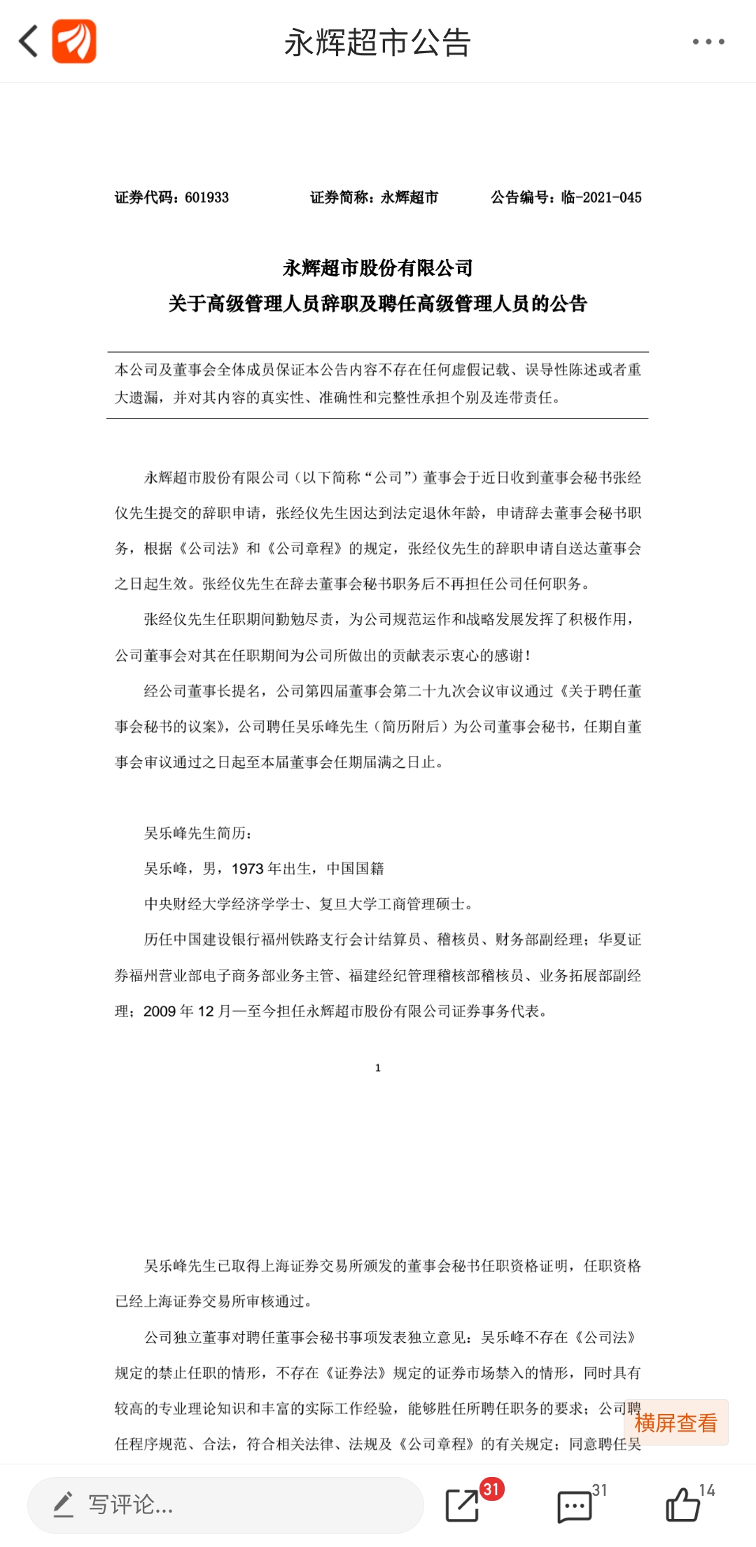 (永辉超市公告)