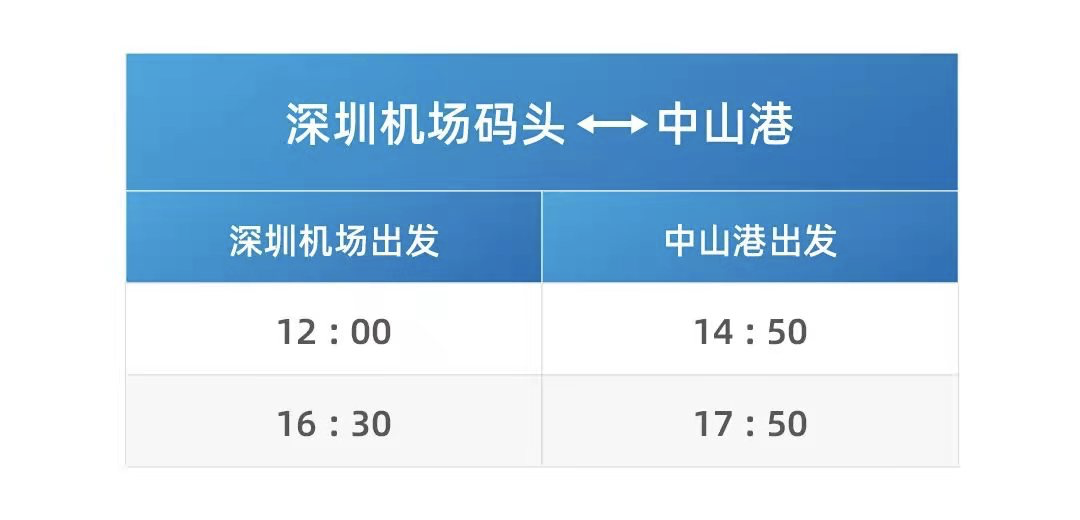 从7月9日起,深圳机场码头至中山航线将恢复2个往返航班运营,服务时间由中午12:00至下午17:50,其中由深圳机场码头出发的航班时刻为12:00和16:30,由中山港出发的航班时刻为14:50和17:50。