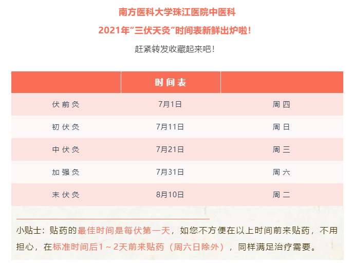 本周日(7月11日)就是三伏天的初伏。记者了解到,目前广东省中医院、广州医科大学附属第一医院、南方医科大学珠江医院、广东祈福医院、广州医科大学附属中医医院等广州多家医院已宣布2021年“三伏贴”开放预约。