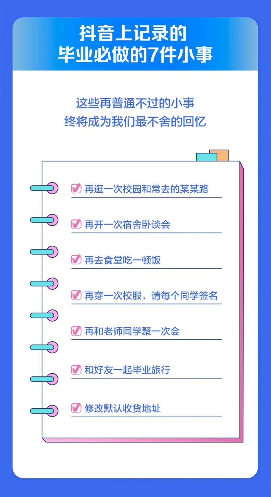 数据显示,毕业照、毕业典礼、毕业告白、毕业设计展、毕业旅行成为获赞最多的毕业仪式TOP5。“再去逛一次校园”、“再开一次宿舍卧谈会”、“再去食堂吃一顿饭”、“再穿一次校服,请每个同学签名”、“再和老师同学聚一次会”、“和好友一起毕业旅行”和“修改默认收货地址”,成为学子们毕业前必做的7件小事。