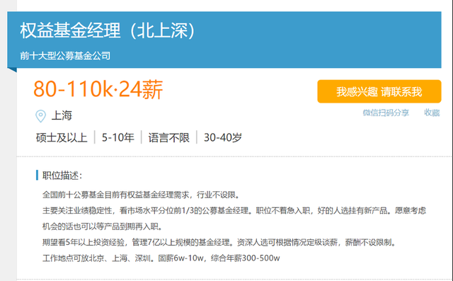 对一位成熟基金经理来说,百万年薪只是起步价。一家前十公募基金的权益基金经理招聘信息要求,五年经验以上,业绩稳定在市场前三分之一的分位值,开出的报酬则在300万~500万年薪之间。