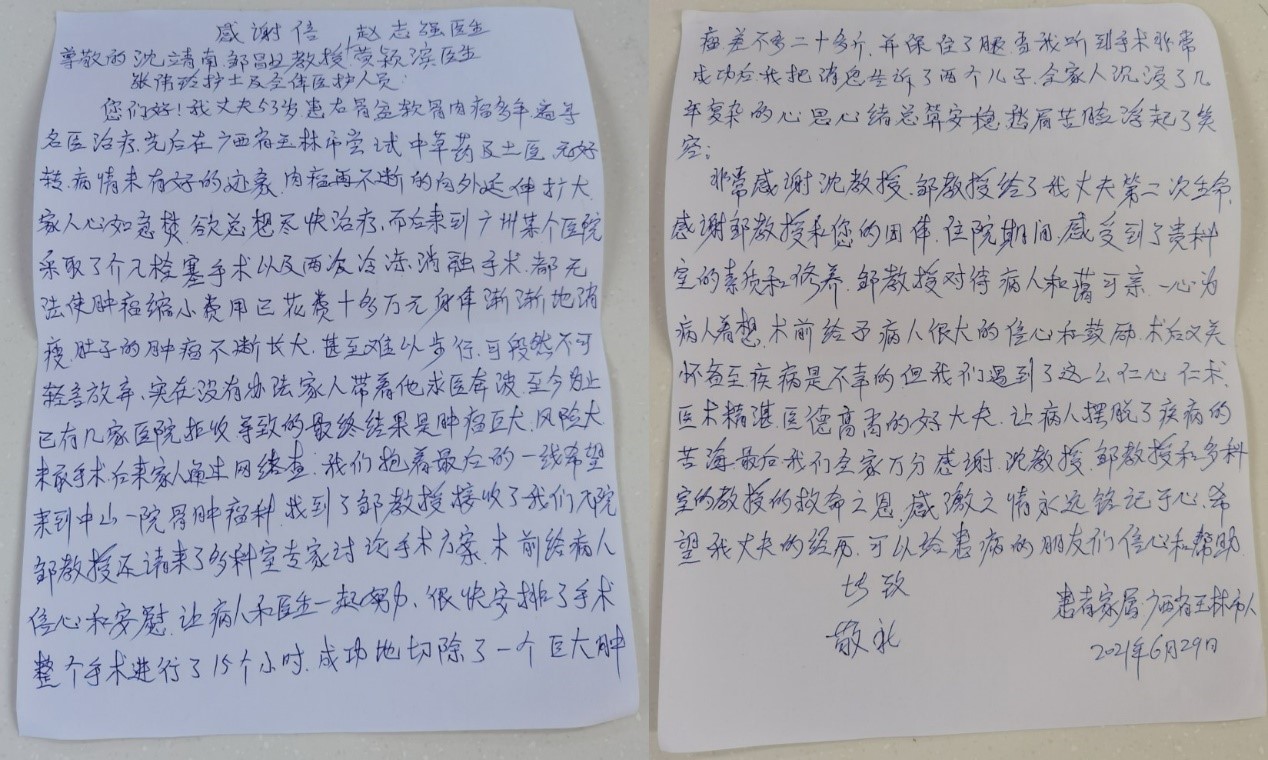 在出院前,患者家属写来了一封情真意切的感谢信以表达他们对医护团队的感谢之情,信中写道:“非常感谢沈主任、邹教授给了我丈夫第二次生命,在住院期间,我们衷心感受到了您团队的温暖,邹教授对待病人和蔼可亲,一心为病人着想,术前给予了病人很大的信心和鼓励,术后又关怀备至。我们知道,疾病是不幸的,但我们遇到了这么仁心仁术、医技精湛、医德高尚的好大夫,让病人脱离了疾病的苦海。我们全家万分感谢,感谢沈主任、邹教授和多学科团队的救命之恩,这份感激之情将永远铭记于心,希望我丈夫的经历,可以给其他患者更多的信心和帮助。”