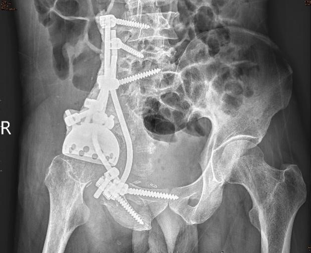 切除肿瘤后,中山一院胃肠外科吴晖副教授协助探查腹腔及修补腹膜,在多学科团队协助下,进行半骨盆假体重建,保留右侧肢体及功能。