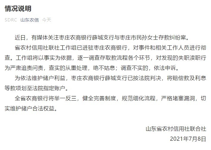 为依法维护储户利益,枣庄农商银行薛城支行已按法院判决,将赔偿款及利息等款项划至法院指定账户。